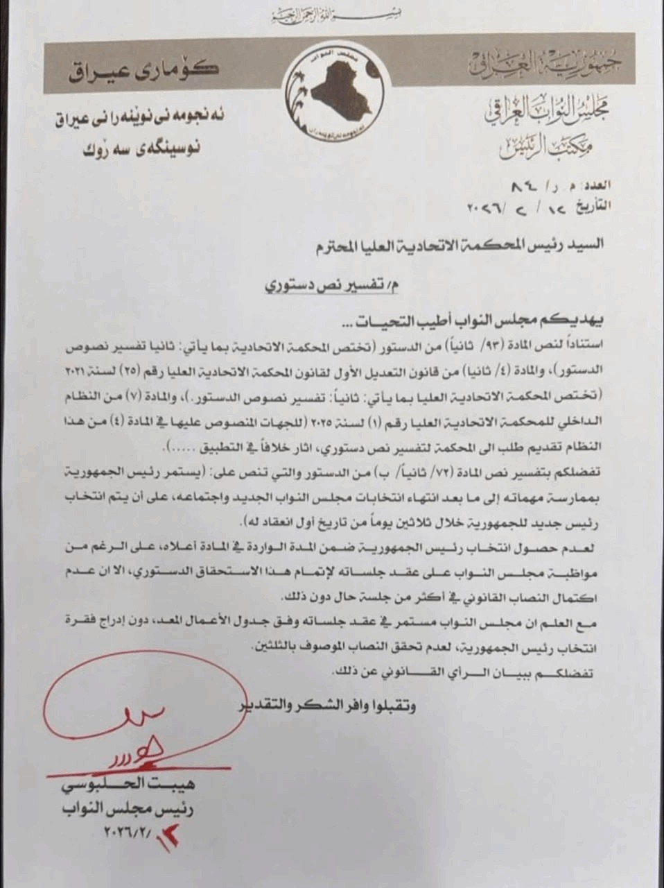 أربيل (كوردستان 24)- خاطب رئيس مجلس النواب العراقي، هيبت الحلبوسي، المحكمة الاتحادية العليا رسمياً لطلب تفسير دستوري يتعلق باستمرار رئيس الجمهورية في ممارسة مهامه، وذلك بعد إخفاق البرلمان في انتخاب رئيس جديد ضمن المدة القانونية المحددة.