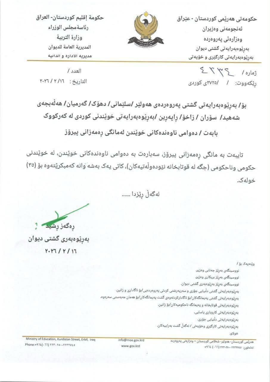 وأوضح البيان أن القرار يشمل جميع المدارس الحكومية والأهلية (غير الحكومية) في محافظات أربيل، والسليمانية، ودهوك، وحلبجة، بالإضافة إلى الإدارات المستقلة (كرميان، سوران، زاخو، ورابرين)، ومديرية الدراسة الكوردية في محافظة كركوك.