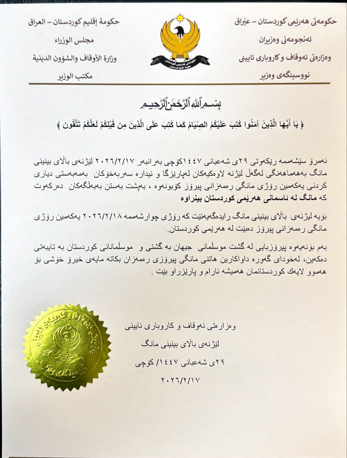 أربيل (كوردستان 24)- أعلنت وزارة الأوقاف والشؤون الدينية في حكومة إقليم كوردستان، أن يوم غدٍ الأربعاء الموافق لـ 18 شباط فبراير 2026 سيكون غرة شهر رمضان المبارك.