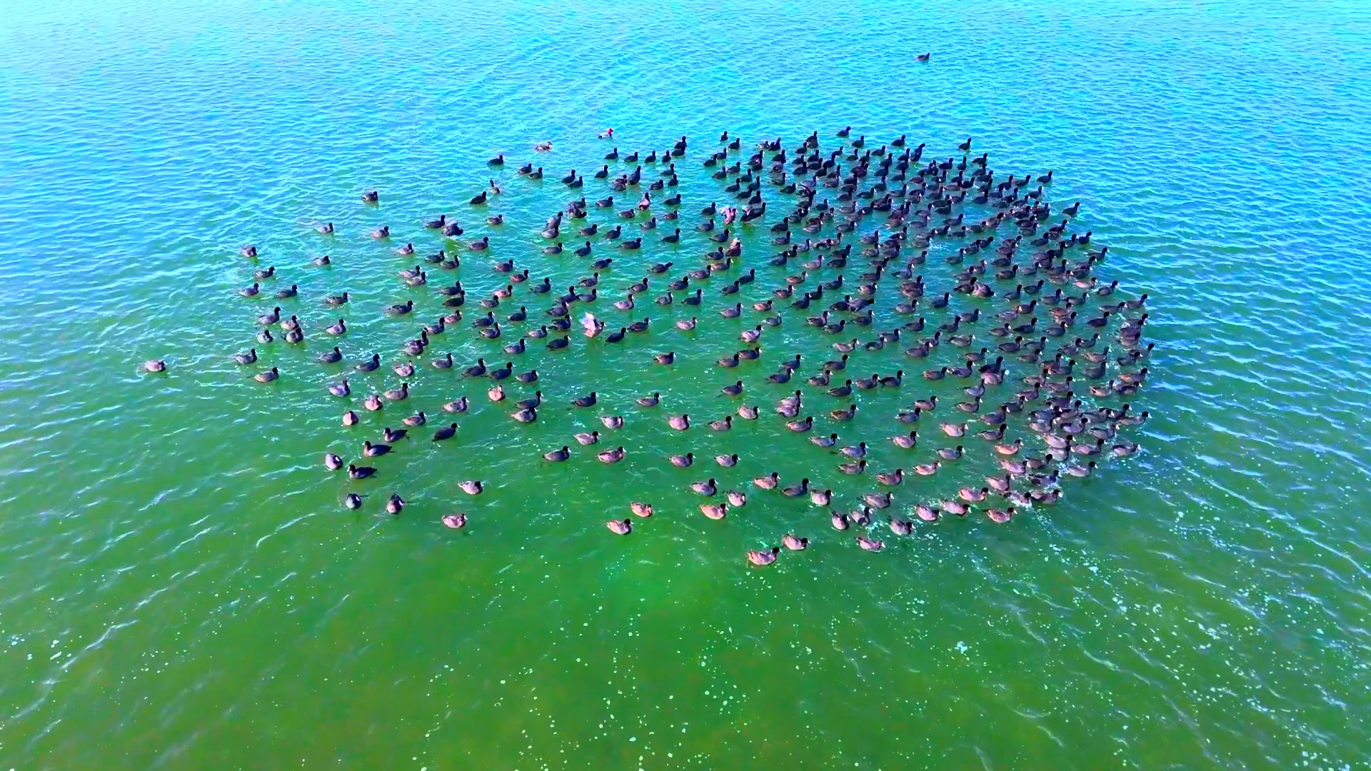 وبينما تسبح أسراب الطيور بهدوء فوق مياه البحيرة، تشق القطارات طريقها وسط الحقول البيضاء الممتدة، وتهبط الطائرات في المطار المحاذي للجبال، في مشهد سينمائي يوثق عظمة الخالق وجمال الطبيعة.