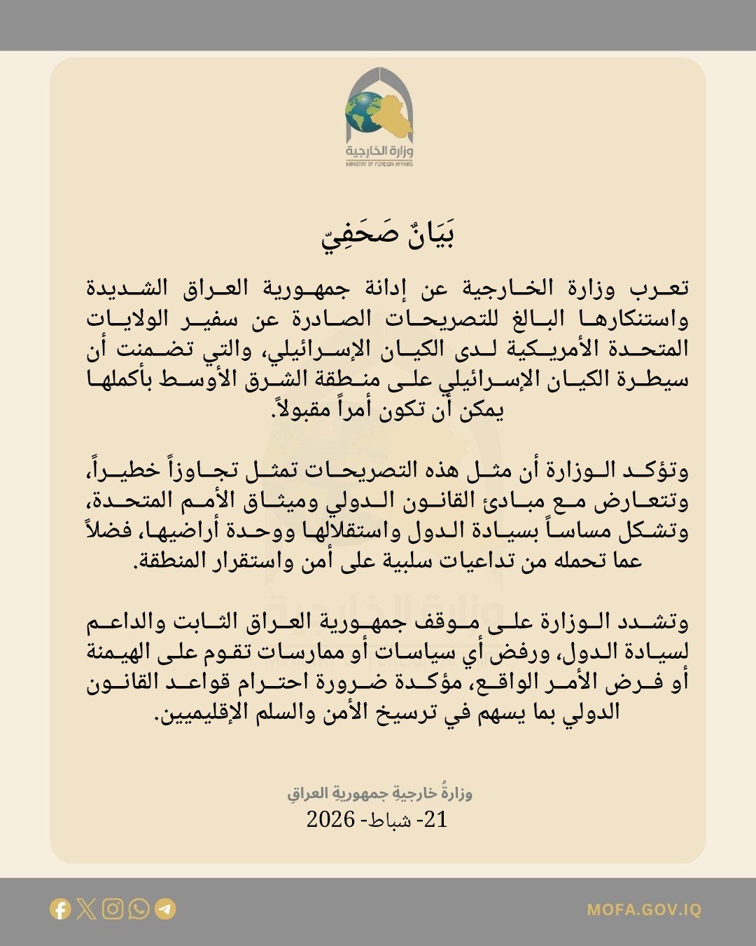 وشددت الخارجية في بيانها على "موقف جمهورية العراق الثابت والداعم لسيادة الدول، مؤكدة رفض بغداد القاطع لأي سياسات أو ممارسات تقوم على منطق الهيمنة أو محاولة فرض الأمر الواقع".