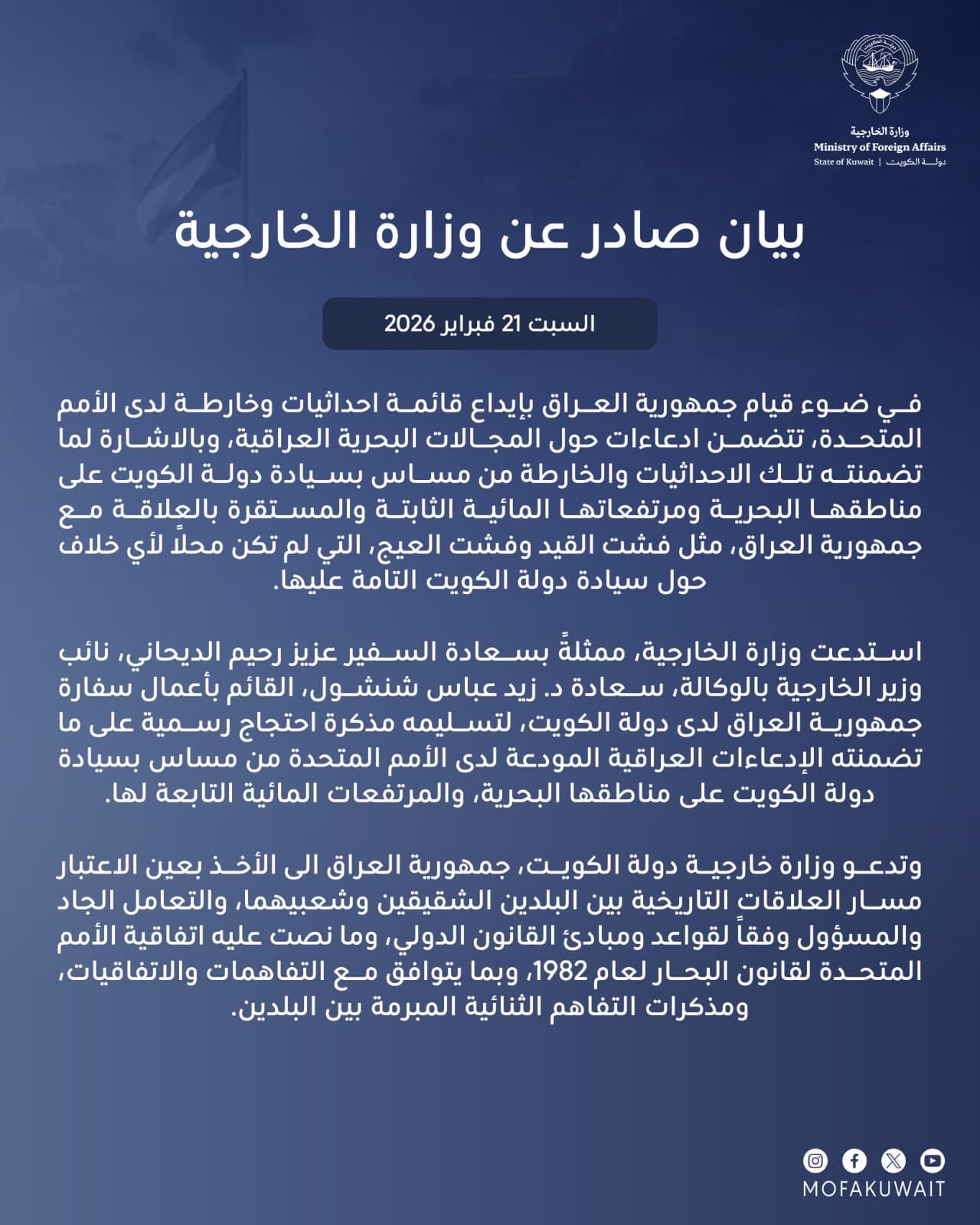 وفي هذا السياق، استدعى نائب وزير الخارجية بالوكالة، السفير عزيز رحيم الديحاني، القائم بأعمال سفارة جمهورية العراق لدى دولة الكويت، زيد عباس شنشول، حيث سلمه مذكرة الاحتجاج الرسمية التي تعبر عن رفض دولة الكويت القاطع لما ورد في الإيداع العراقي لدى المنظمة الدولية.