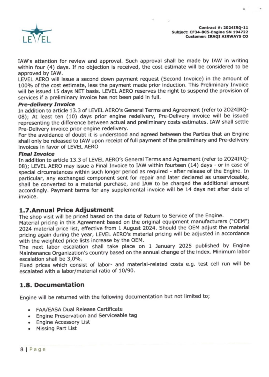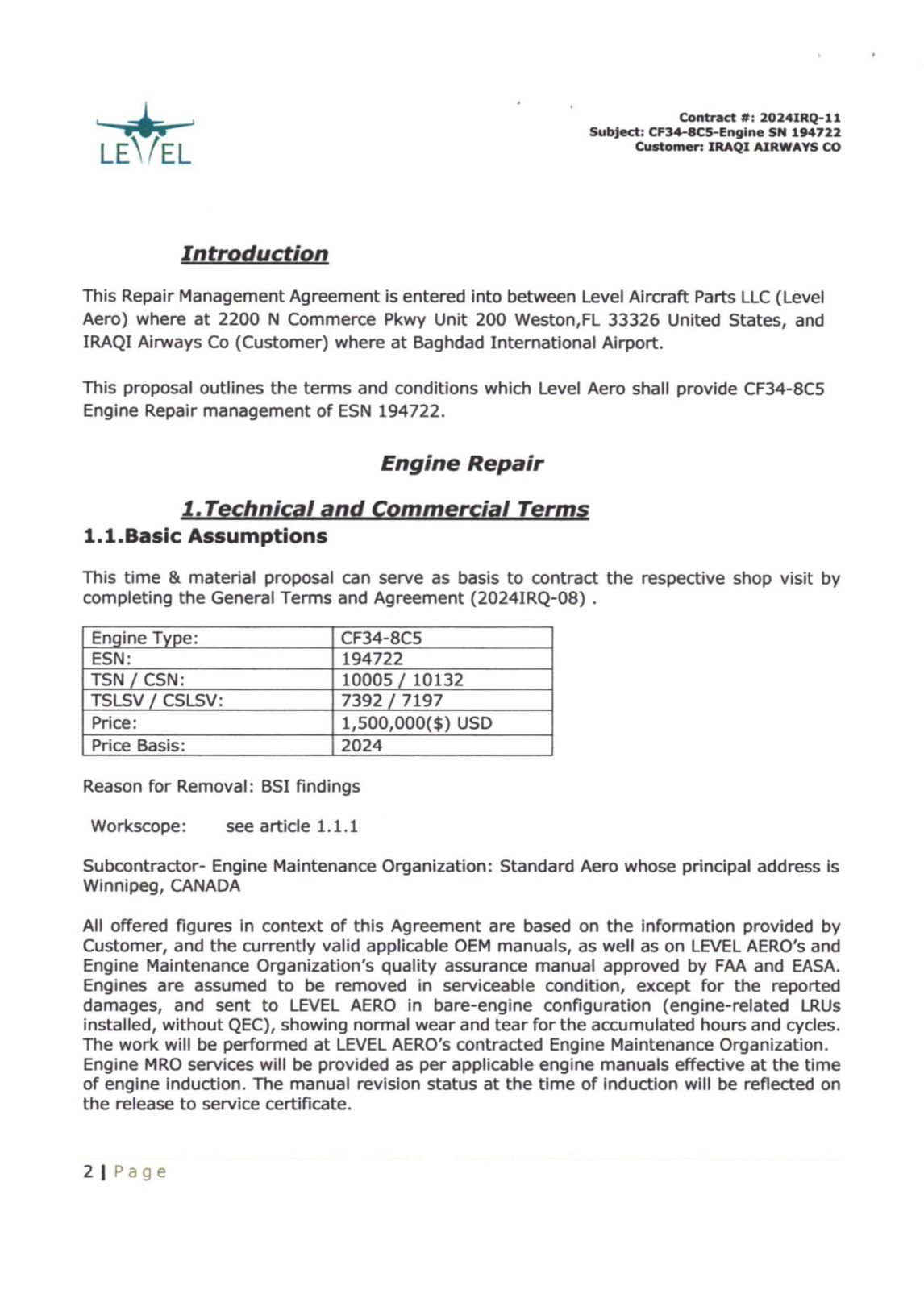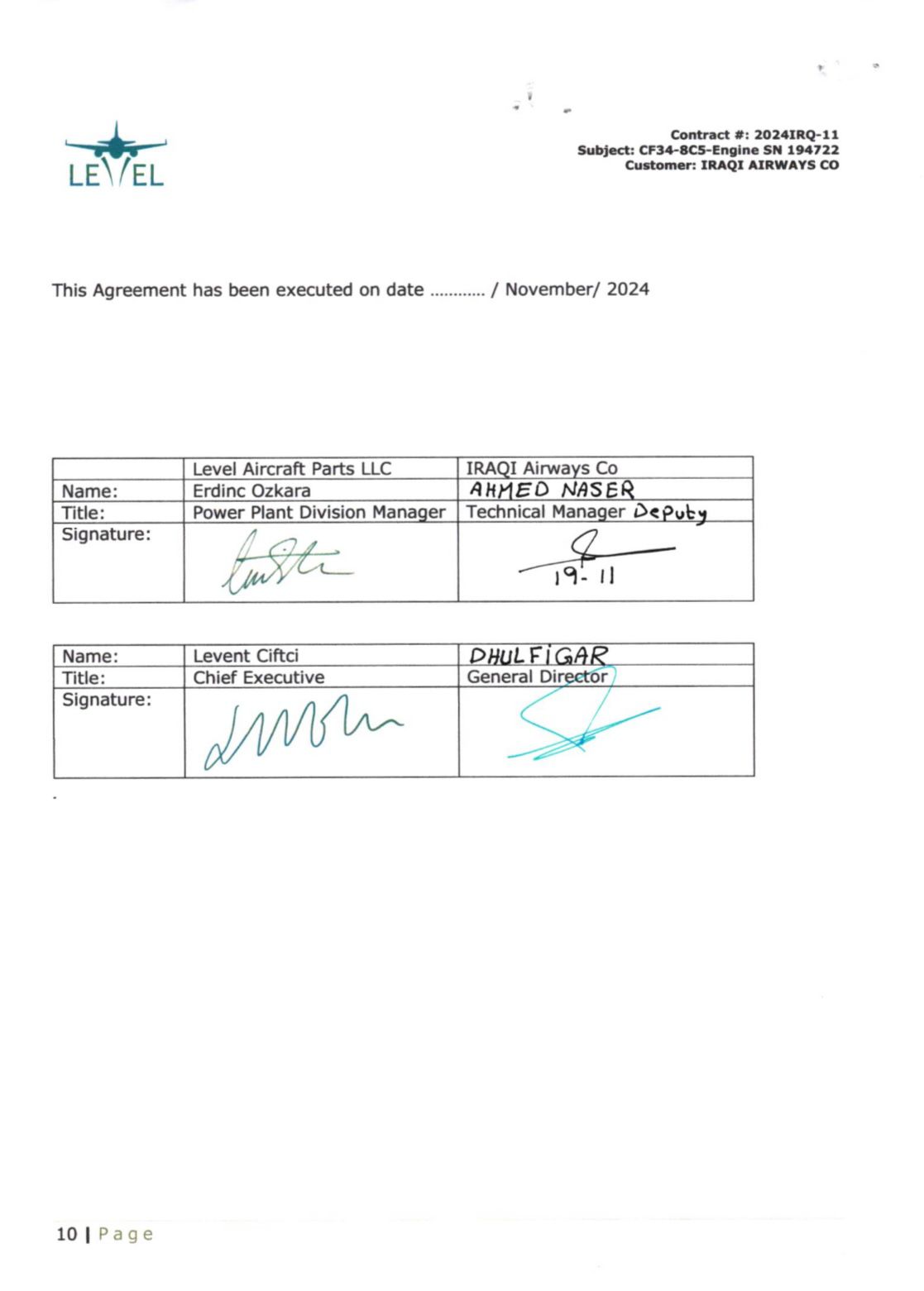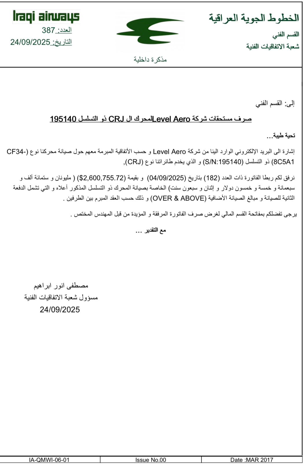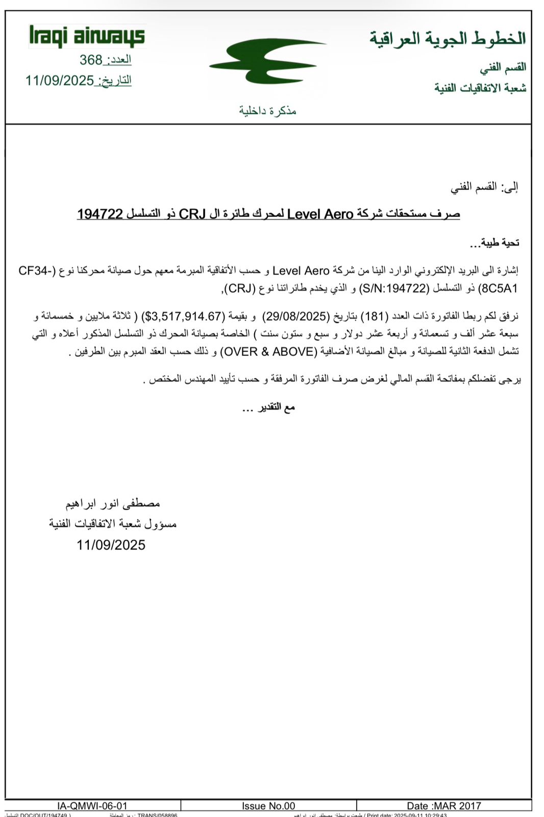 على الرغم من صدور قرار مجلس الوزراء رقم (855) لسنة 2025، والذي ألزم إدارة الشركة بوضوح في النقطة (4 - أ، ب) بضرورة إجراء الصيانة وتجهيز قطع الغيار لدى شركات رصينة ومعتمدة دولياً، إلا أن الإدارة الحالية ذهبت بعيداً بتعاقدات مشبوهة مع شركات وسيطة وغير مرخصة دولياً، من بينها شركتا (Aet) و(Level Aero).