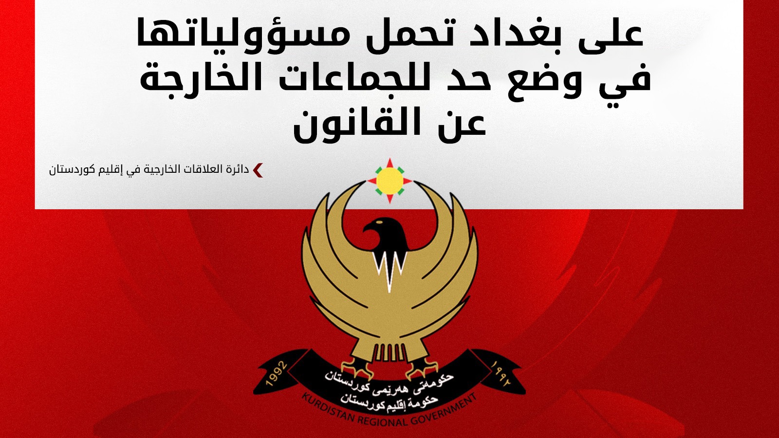 ووجهت دائرة العلاقات الخارجية دعوة صريحة للحكومة الاتحادية في بغداد، مطالبةً إياها بـ "تحمل مسؤولياتها في حماية سيادة العراق، ووضع حدٍ لتلك الجماعات المتطرفة والخارجة عن القانون داخل البلاد، والتي تواصل استهداف إقليم كوردستان بذرائع واهية وبشكل مستمر".