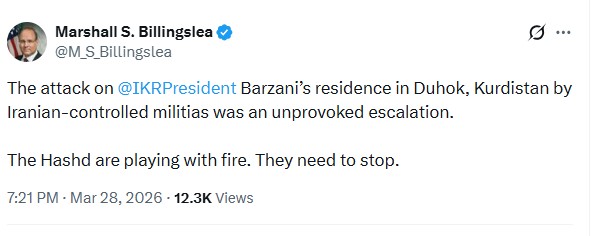 وفي تدوينة له عبر حسابه الرسمي على منصة "إكس"، وجه بيلينغسلي أصابع الاتهام مباشرة إلى الفصائل المسلحة الموالية لطهران، قائلاً: "إن الهجوم الذي شنته الميليشيات التي تسيطر عليها إيران على مقر إقامة رئيس اقلیم کوردستان يمثل تصعيداً دون سابق إنذار".