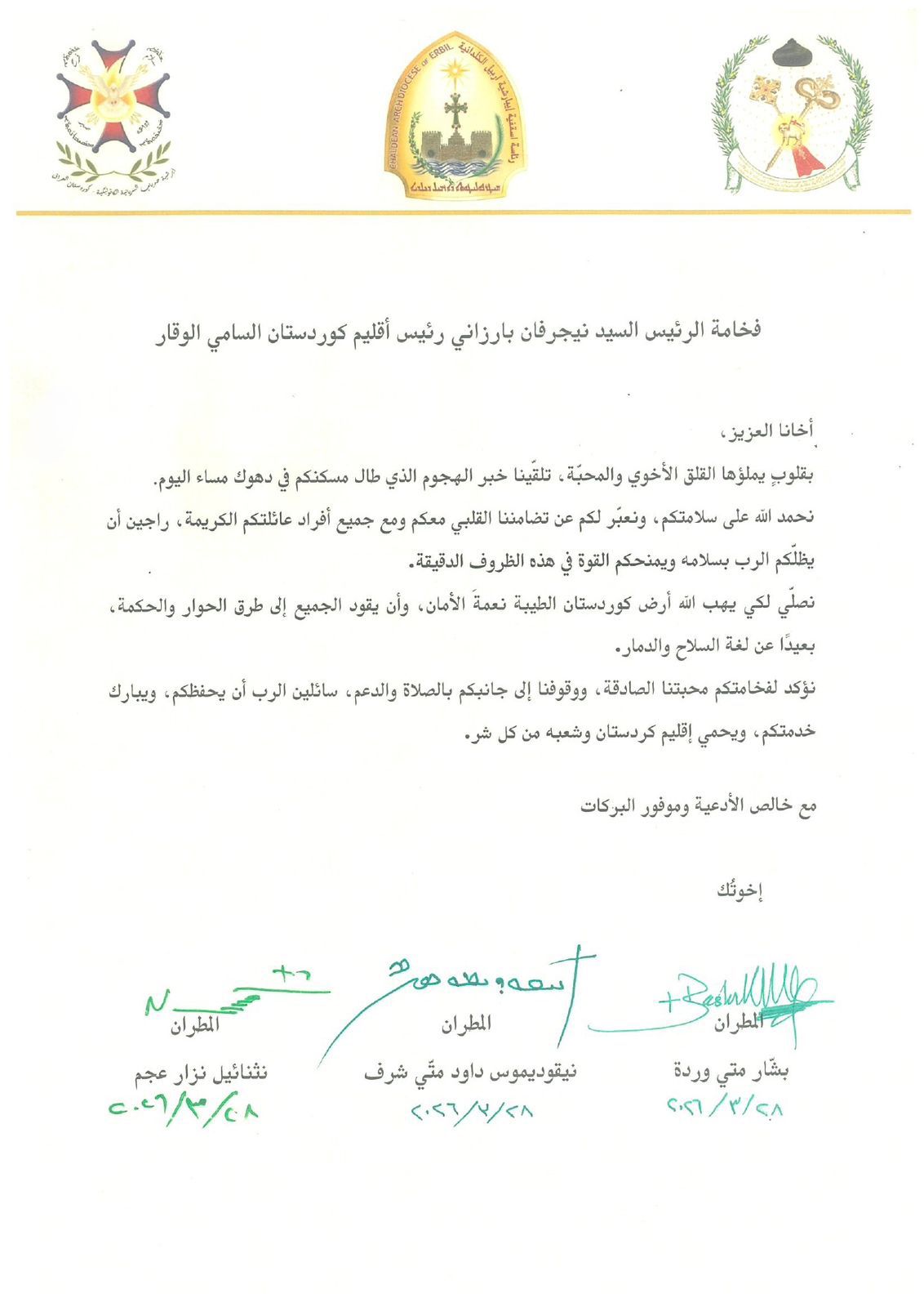 وفي رسالة مشتركة وجهها كل من المطران بشار متي وردة، والمطران نيقوديموس داود متي شرف، والمطران نثنائيل نزار عجم، عبّر المطارنة عن "قلقهم الأخوي" فور تلقيهم نبأ الهجوم، مؤكدين تضامنهم القلبي مع رئيس الاقلیم وأفراد عائلته الكريمة.