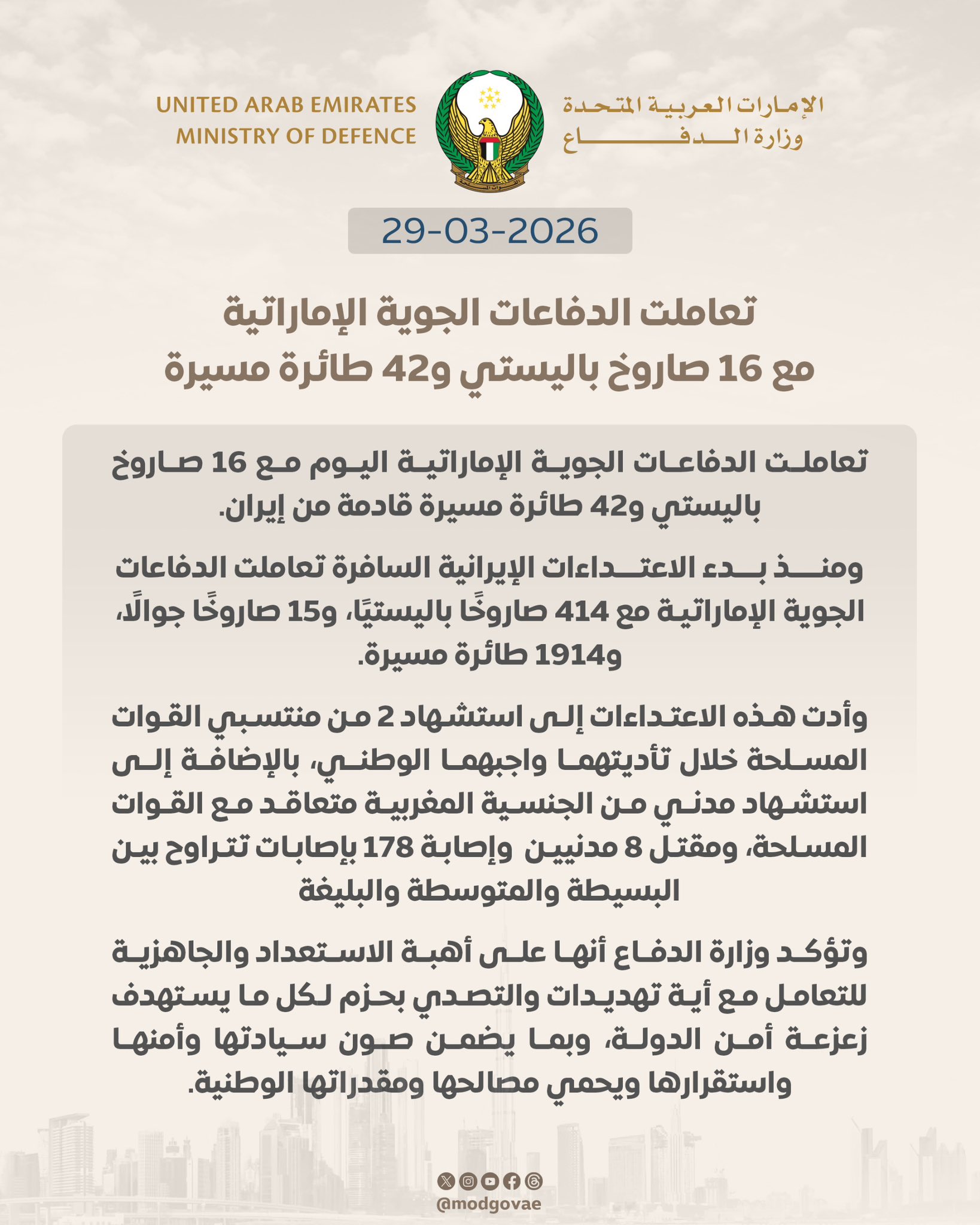 وأشارت إلى أنه منذ بدء "الاعتداءات الإيرانية السافرة" تعاملت الدفاعات الجوية الإماراتية مع 414 صاروخاً باليستياً، و15 صاروخا جوالا، و 1914 طائرة مسيرة.