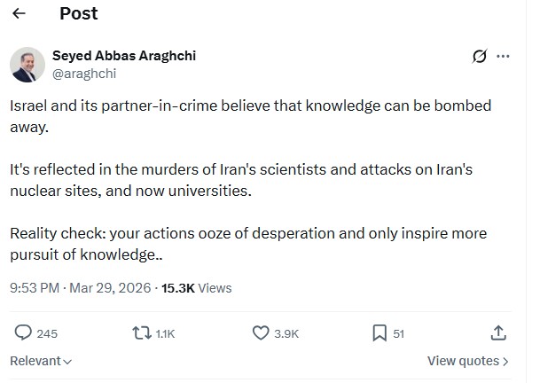 وقال عراقجي في تدوينة له على منصة "إكس": "تعتقد إسرائيل وشريكها في الجريمة أن المعرفة يمكن قصفها والتخلص منها"، مشيراً إلى أن هذا الفكر يتجسد في عمليات اغتيال العلماء الإيرانيين، والهجمات التي استهدفت المواقع النووية، وصولاً إلى استهداف الجامعات مؤخراً.