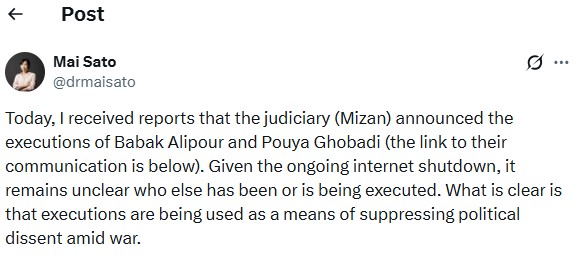 أدلت ماي ساتو بهذا التصريح في صحيفة "إكس" بعد إعدام اثنين آخرين من أعضاء جماعة مجاهدي خلق الإيرانية في المنفى يوم الثلاثاء.