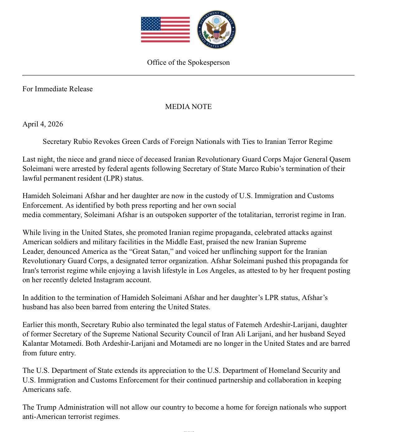 وقال متحدث باسم الوزارة في بيان إن عملاء فدراليين أوقفوا الليلة الماضية قريبتين لسليماني، بعدما ألغى وزير الخارجية ماركو روبيو إقامتهما. وحدد البيان هوية إحداهما وتدعى حميدة سليماني أفشار، متهماً إياها بتأييد الجمهورية الإسلامية علناً.