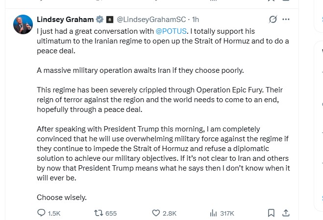 وأضاف غراهام أنه يؤيد "بشكل كامل" إنذار ترامب بضرب مواقع الطاقة إذا لم تُعد إيران فتح مضيق هرمز بحلول 6 نيسان/ابریل. وكان الرئيس قد أبلغ إيران في منشور على وسائل التواصل الاجتماعي هذا الصباح أن أمامها 48 ساعة.
