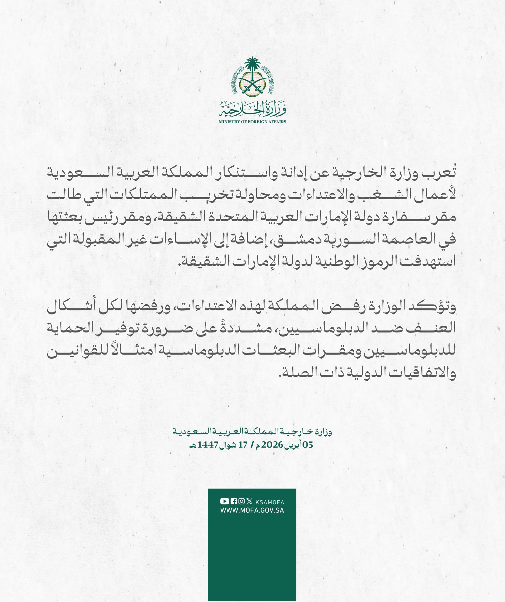 السعودية تدين الاعتداء على سفارة الإمارات بدمشق وتشدد على حماية البعثات الدبلوماسية