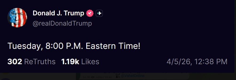 ويأتي هذا المنشور الغامض في أعقاب تهديدات أطلقها ترامب في وقت سابق، حدد فيها يوم الثلاثاء موعداً نهائياً لإيران لفتح مضيق هرمز، مهدداً باستهداف جسور ومحطات طاقة في حال عدم الاستجابة لمطالبه. ويرى مراقبون أن هذا التوقيت قد يكون ساعة الصفر لبدء العمليات العسكرية التي هدد بها، أو موعداً لإدلاء ببيان هام حول نتائج المفاوضات الجارية.