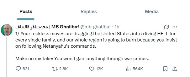 واختتم قاليباف تغريدته برسالة حازمة قال فيها: "لا تخطئوا؛ لن تحققوا أي مكاسب من خلال جرائم الحرب"، في إشارة واضحة إلى العمليات العسكرية المستمرة والدعم الأمريكي المطلق لإسرائيل في التوترات الراهنة.