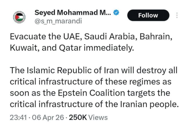 وبحسب ما نقلته وكالة "فارس" للأنباء، كتب مرندي في تدوينة له: "غادروا الإمارات العربية المتحدة، والسعودية، والبحرين، والكويت، وقطر فوراً".