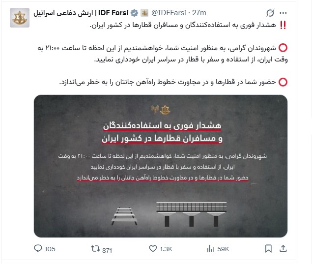 وجاء في بيان صادر عن الجيش الإسرائيلي: "أيها المواطنون الأعزاء، حرصاً على سلامتكم، نرجو منكم الامتناع عن استخدام القطارات والسفر بها في جميع أنحاء إيران من هذه اللحظة وحتى الساعة 9:00 مساءً بتوقيت إيران".