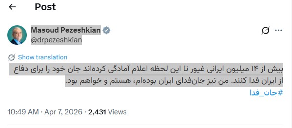 وفي تغريدة نُشرت اليوم، 7 نيسان/أبريل 2026، أكد بزشكيان أن "أكثر من 14 مليون إيراني غيور" أعلنوا حتى هذه اللحظة استعدادهم الكامل لبذل أرواحهم فداءً للدفاع عن تراب إيران.