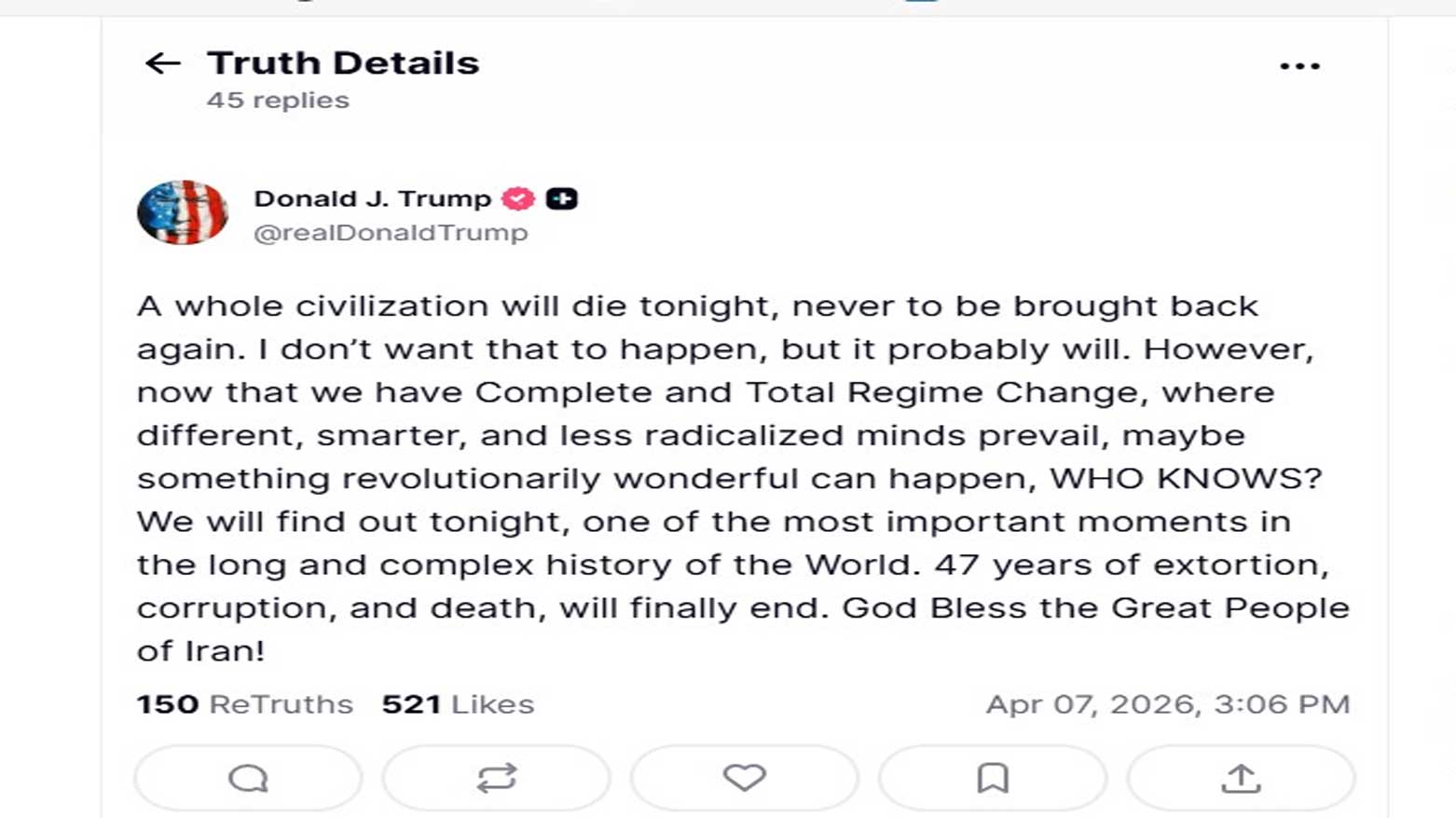 وقال ترامب في منشور عبر منصته "تروث سوشيال": "حضارة كاملة ستموت الليلة، ولن تعود أبداً. أنا لا أريد لهذا أن يحدث، لكنه سيحدث على الأرجح".