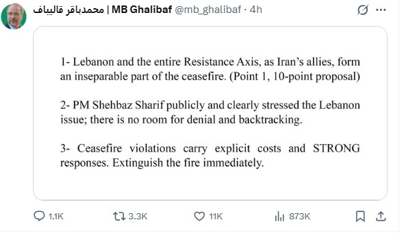 أوضح قاليباف أن لبنان وحلفاء إيران في "محور المقاومة" هم جزء لا يتجزأ من بنود وقف إطلاق النار، مشيراً إلى أن هذا المبدأ يمثل النقطة الأولى في مقترح مكون من 10 نقاط يتم تداوله حالياً.