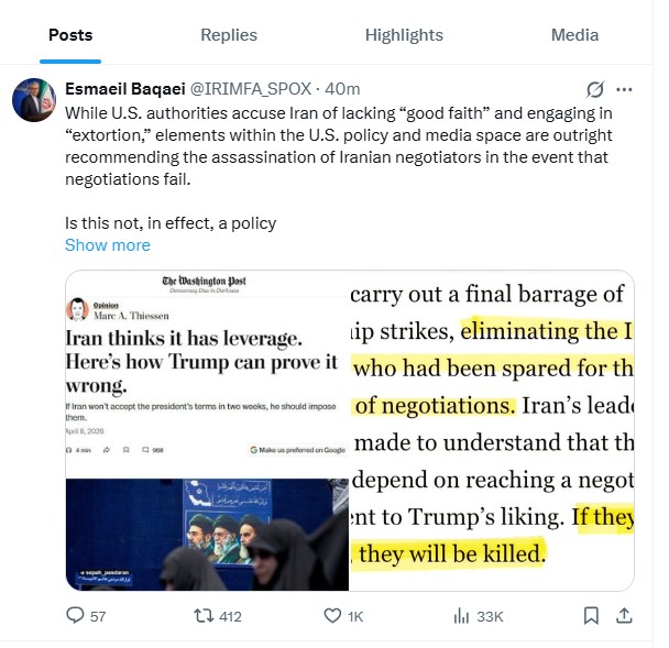 وفي تغريدة له عبر منصة "إكس" (تويتر سابقاً)، أشار بقائي إلى مقال رأي نُشر في صحيفة "واشنطن بوست" للكاتب "مارك ثيسن"، تناول فيه كيفية تعامل الإدارة الأمريكية المقبلة بقيادة دونالد ترامب مع إيران. وسلط بقائي الضوء على أجزاء من المقال تدعو صراحة إلى "تصفية" المسؤولين الإيرانيين الذين تم استثناؤهم سابقاً من أجل المفاوضات، محذراً من أن هؤلاء "سيُقتلون" إذا لم يتم التوصل إلى اتفاق يرضي واشنطن.