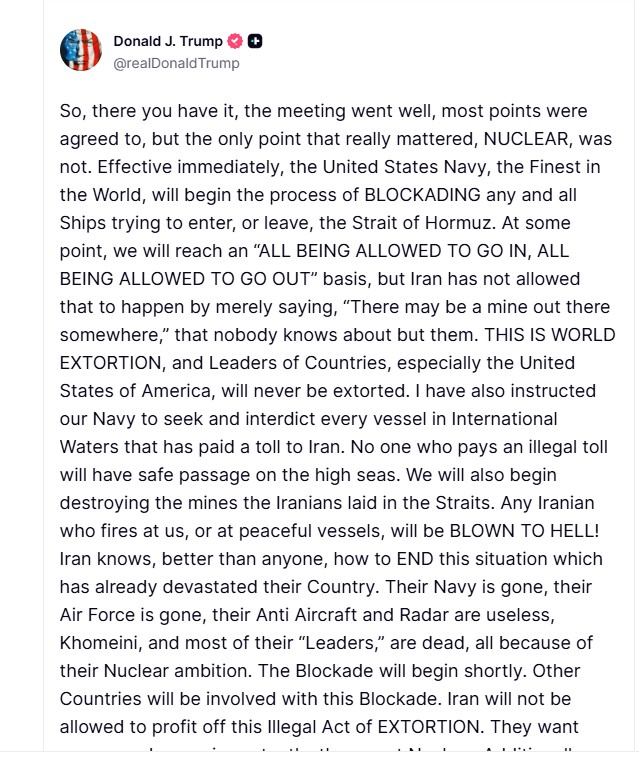 وفي منشور له عبر منصات التواصل الاجتماعي (تروث)، أكد الرئيس ترامب أن الاجتماعات الأخيرة حققت توافقاً في عدة نقاط، إلا أنها تعثرت في النقطة الأكثر أهمية وهي الملف النووي. وأضاف: "بدأنا فوراً عملية حصار ومنع دخول أو خروج أي سفينة عبر مضيق هرمز"، مشيراً إلى أن الولايات المتحدة لن ترضخ للتهديدات الإيرانية بوجود ألغام بحرية، وهي الذريعة التي اعتبرها ترامب محاولة لابتزاز المجتمع الدولي.