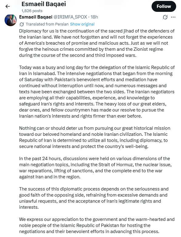 على الجانب الآخر، دخل وزير الخارجية الأسبق محمد جواد ظريف على خط الأزمة، معلقاً على تصريحات "جي دي فانس" (نائب الرئيس الأمريكي) الذي قال إن الإيرانيين رفضوا الشروط الأمريكية. وكتب ظريف عبر منصة "إكس": «لا يمكن لأي مفاوضات مع إيران أن تنجح إذا قامت على منطق "شروطنا مقابل شروطكم". على الولايات المتحدة أن تتعلم أنه لا يمكن إملاء الشروط على طهران، ولم يفت الأوان بعد لتعلم ذلك».