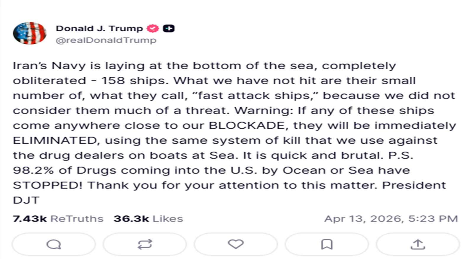 وقال ترامب في منشور على منصة تروث سوشال "تحذير: اذا اقتربت أي من هذه السفن من حصارنا، سيتم القضاء عليها فورا"، في إشارة ضمنية الى الزوارق الهجومية السريعة التي تحوزها إيران.