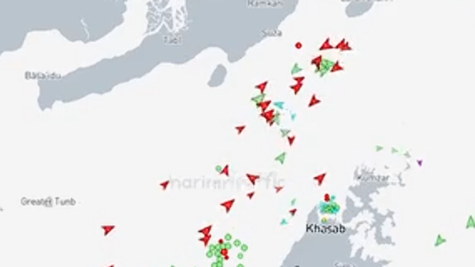 وتشير النقاط الحمراء على الخريطة أعلاه إلى ناقلات النفط المتوقفة، وقد ظهر عدد منها على جانبي المضيق منذ الإعلان عن القيود. بينما تشير الأسهم الحمراء إلى ناقلات النفط التي تحمل غاز البترول المسال والنفط الخام، أما الأسهم الخضراء فتمثل سفن الشحن التي تحمل الحاويات غالباً.