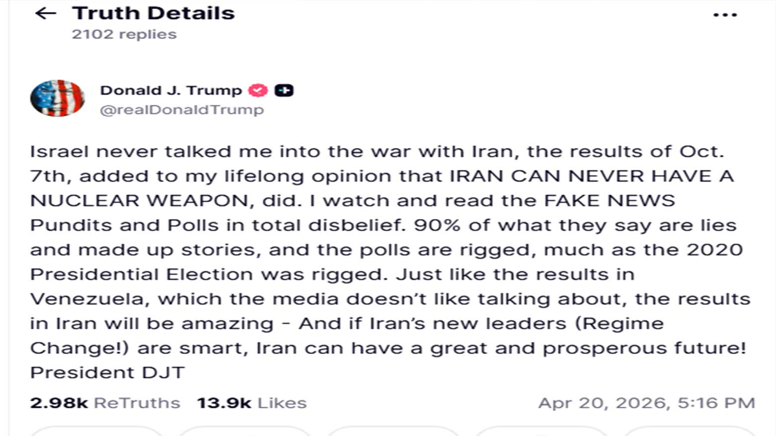 وتطلع ترامب إلى ما وصفه بـ "نتائج مذهلة" في إيران، داعياً بشكل صريح إلى "تغيير النظام" (Regime Change!). وأضاف أن إيران يمكن أن تحظى بـ "مستقبل عظيم ومزدهر" في حال وجود قيادة جديدة وصفها بـ "الذكية".