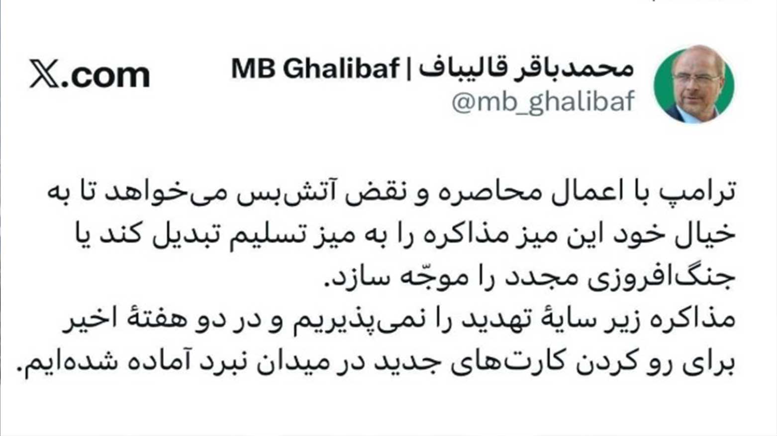 وفي تصريحات نشرها عبر حسابه الرسمي على منصات التواصل الاجتماعي، الیوم الثلاثاء 21 نیسان/ابریل، قال قاليباف: "إن ترامب، عبر فرض الحصار ونقض اتفاقات وقف إطلاق النار، يتوهم القدرة على تحويل طاولة المفاوضات إلى طاولة للاستسلام، أو إيجاد ذرائع لإشعال فتيل الحرب من جديد".
