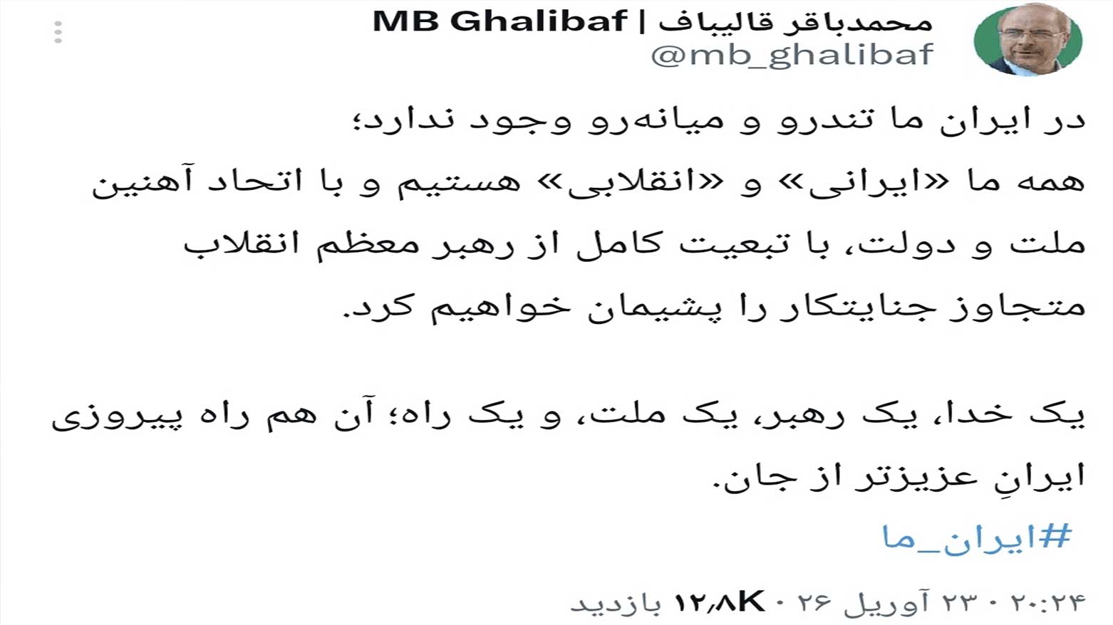 نفي الانقسام: صرح قاليباف بوضوح: "في إيراننا، لا يوجد شيء اسمه متطرف ومعتدل؛ نحن جميعاً إيرانيون وثوريون".