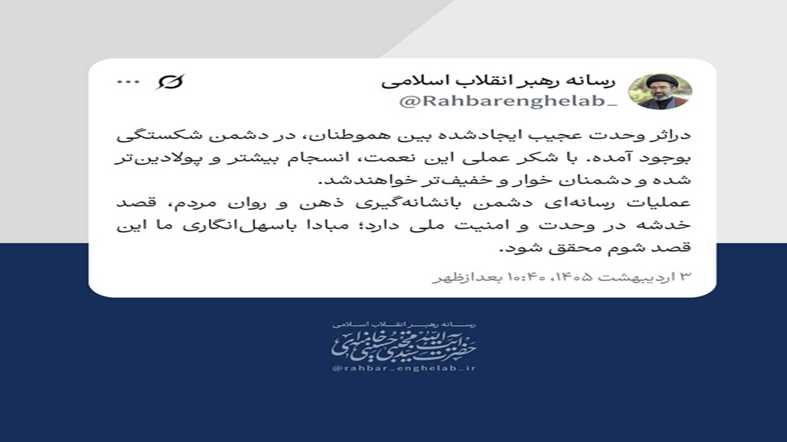 وفي أحدث رسائله، رد مجتبى خامنئي على تصريحات "دونالد ترامب"، مؤكداً أن "هذه الوحدة المذهلة التي تجلت بين المواطنين قد ألحقت الهزيمة بالعدو". كما أعرب عن تقديره لهذا التلاحم قائلاً: "لقد أصبحت وحدتنا أكثر تماسكاً وصلابة، وسيكون الأعداء أكثر ذلاً وهواناً".
