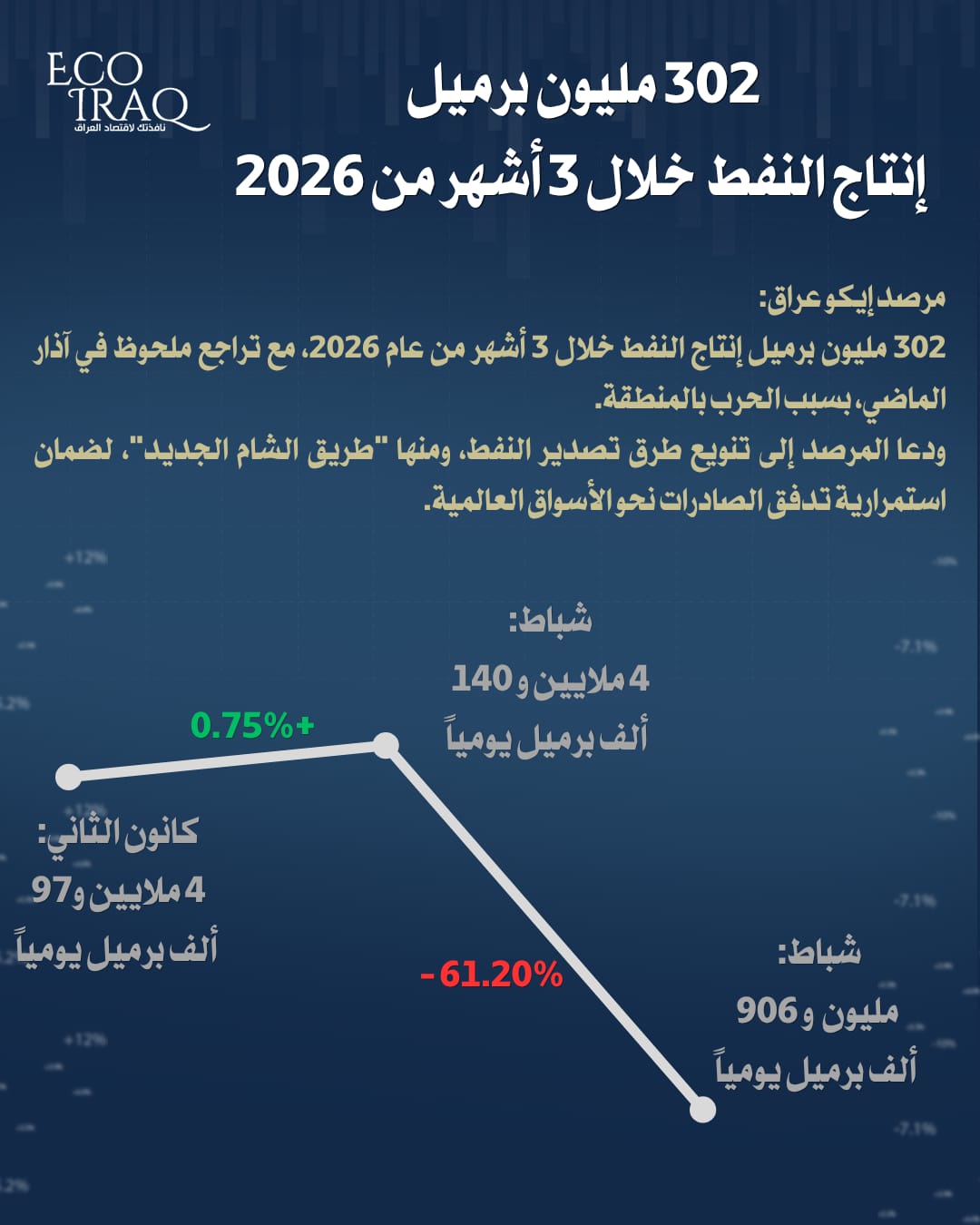 أربيل (كوردستان 24)- أعلن مرصد إيكو عراق، اليوم الأحد، بيانات إنتاج النفط العراقي خلال الأشهر الثلاثة الأولى من عام 2026، فيما دعا المرصد لتنويع تصدير النفط وعدم الاكتفاء بالخليج، ومن البدائل "طريق الشام الجديد".