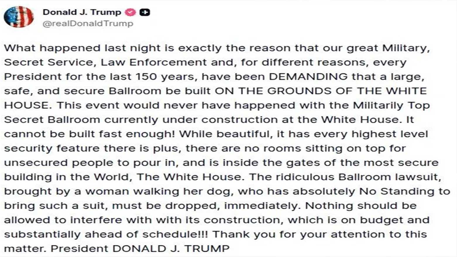 وزعم ترامب في تدوينته أن الجيش الأمريكي، والخدمة السرية، وجهات إنفاذ القانون، بالإضافة إلى كل رئيس أمريكي تعاقب على السلطة في الـ 150 عاماً الماضية، كانوا يطالبون ببناء "قاعة احتفالات كبيرة وآمنة" في ساحة البيت الأبيض.