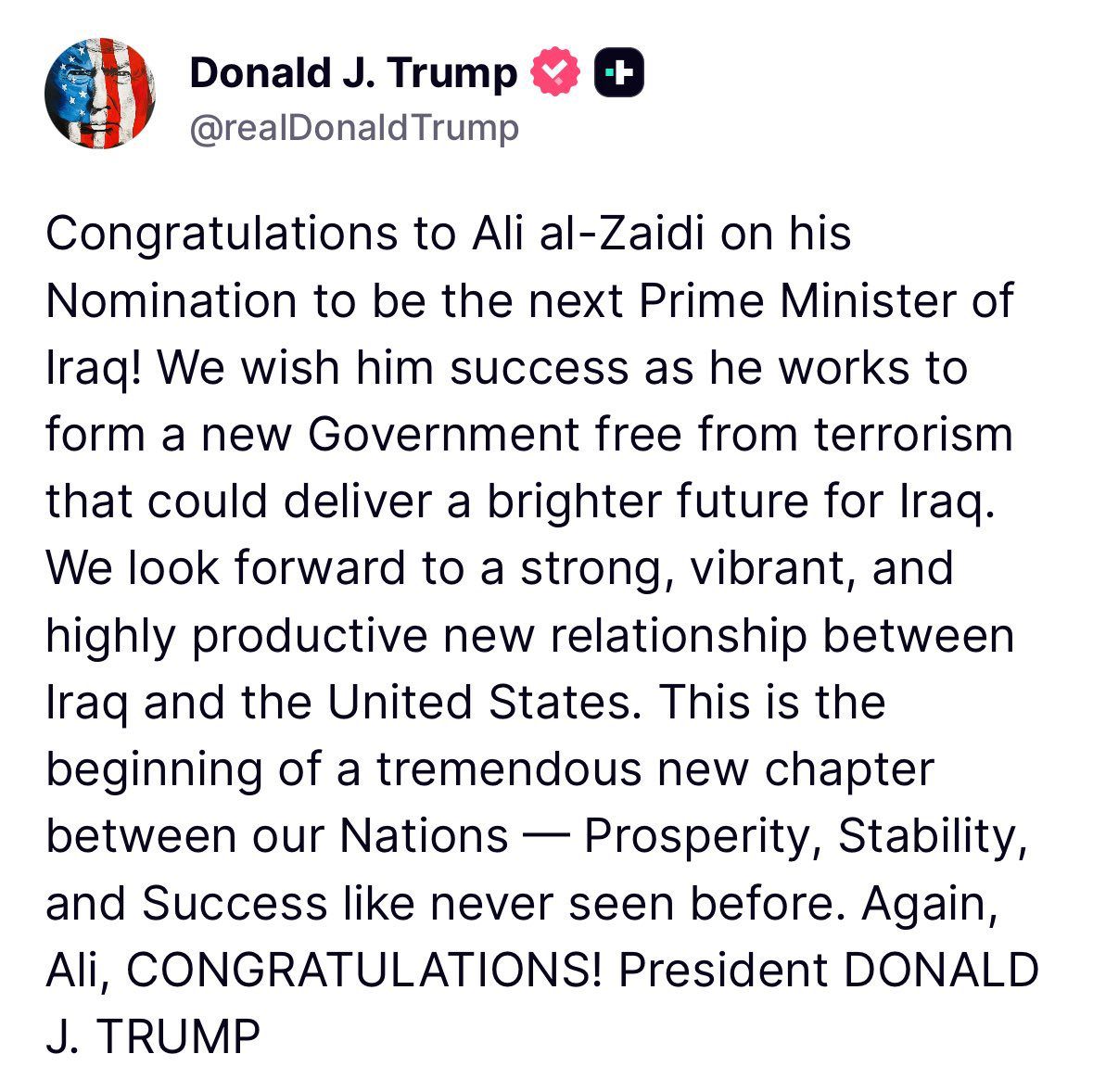 وأضاف ترامب في تدوينته: "نتطلع إلى علاقة جديدة قوية وحيوية ومنتجة للغاية بين العراق والولايات المتحدة. هذه بداية فصل جديد عظيم بين بلدينا، نحو ازدهار واستقرار ونجاح لم يسبق له مثيل.. مبارك مجدداً يا علي".