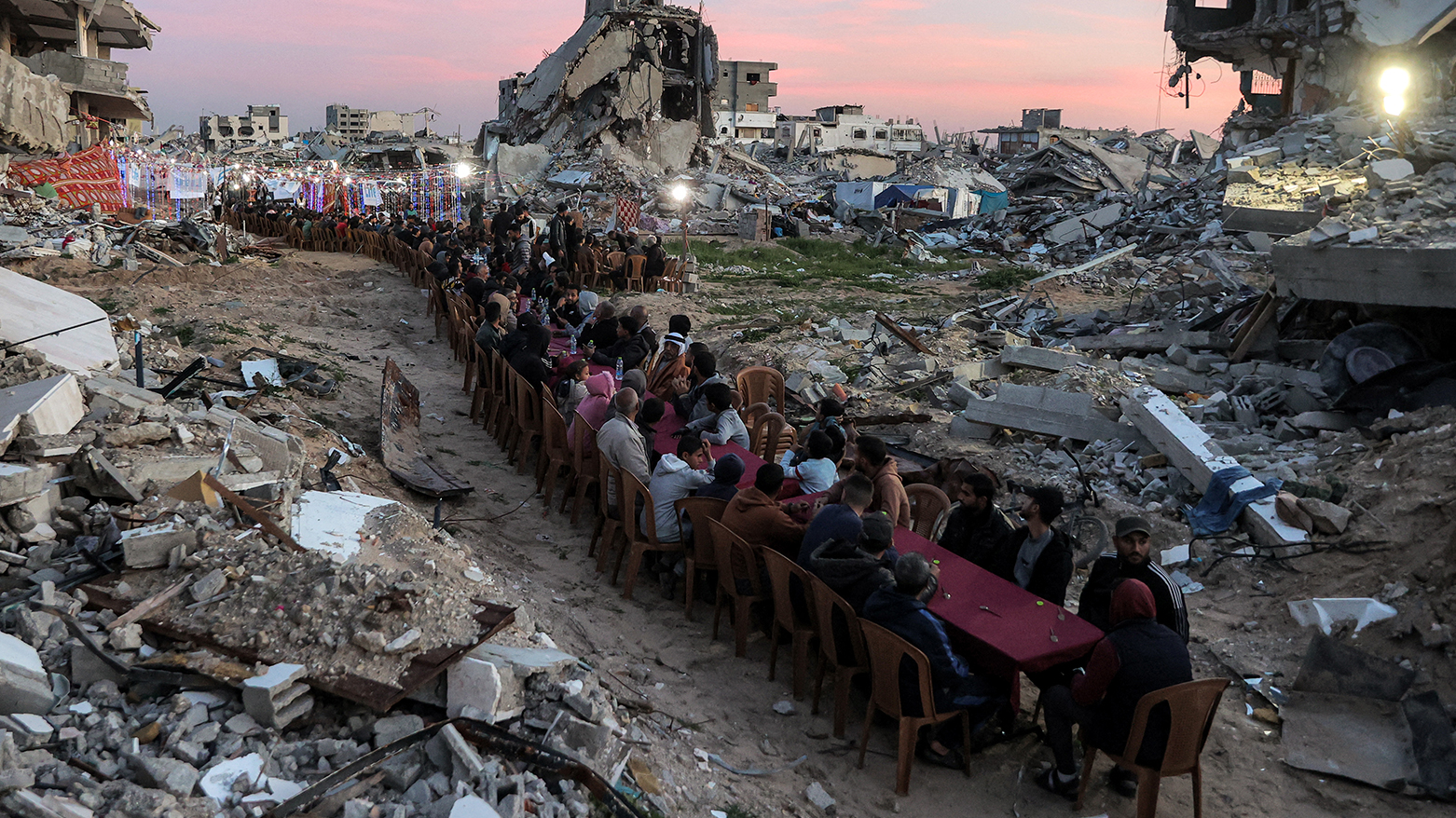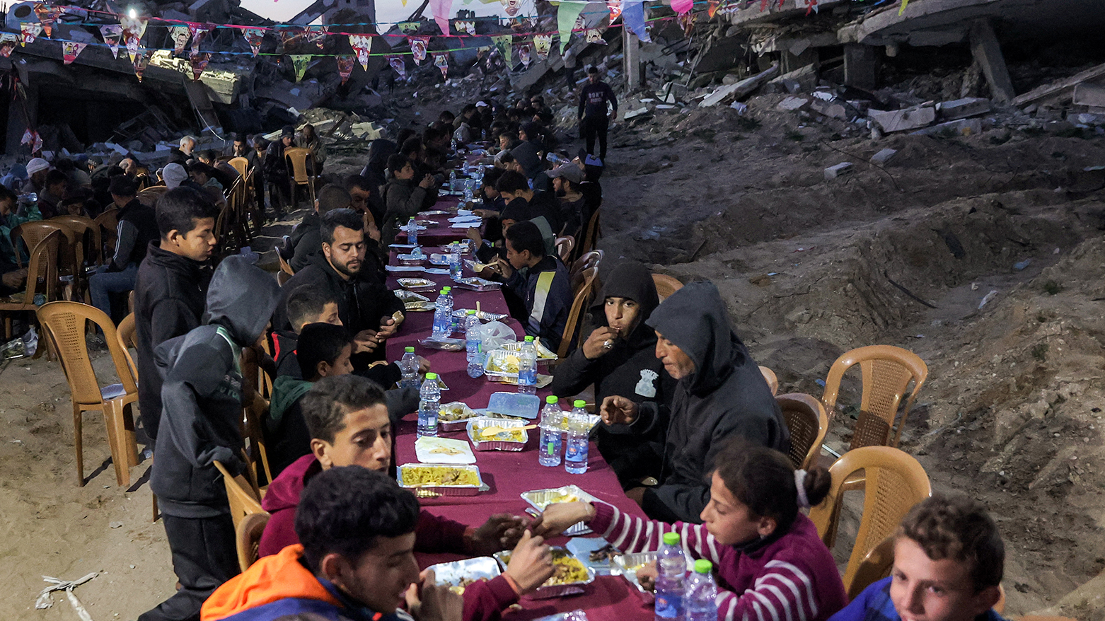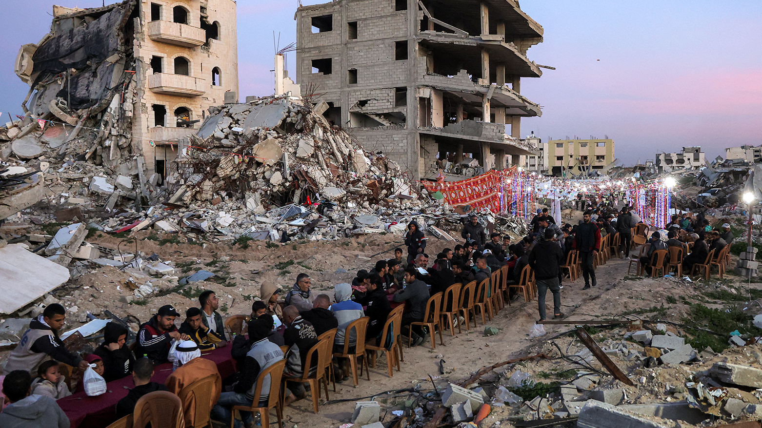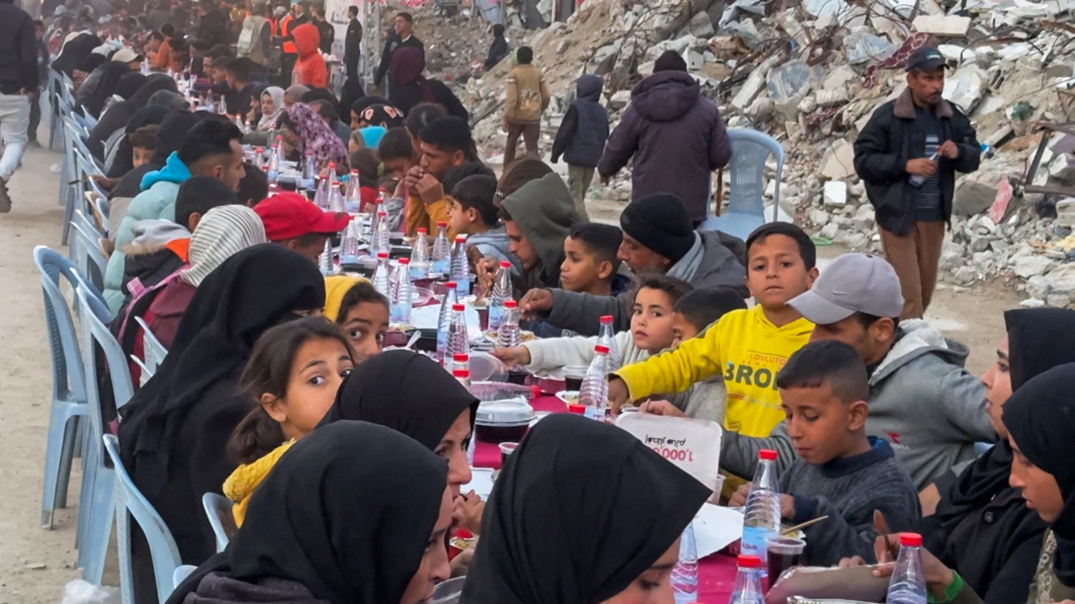 فەڵەستینییەکانی کەرتی غەززە، لە نێو وێرانەیی خانوو و باڵەخانە ڕووخاوەکاندا لە شاری ڕەفەحی باشووری کەرتەکە ئامادەکارییان کردووە بۆ ئەوەی بەربانگی ڕەمەزان بکەنەوە.