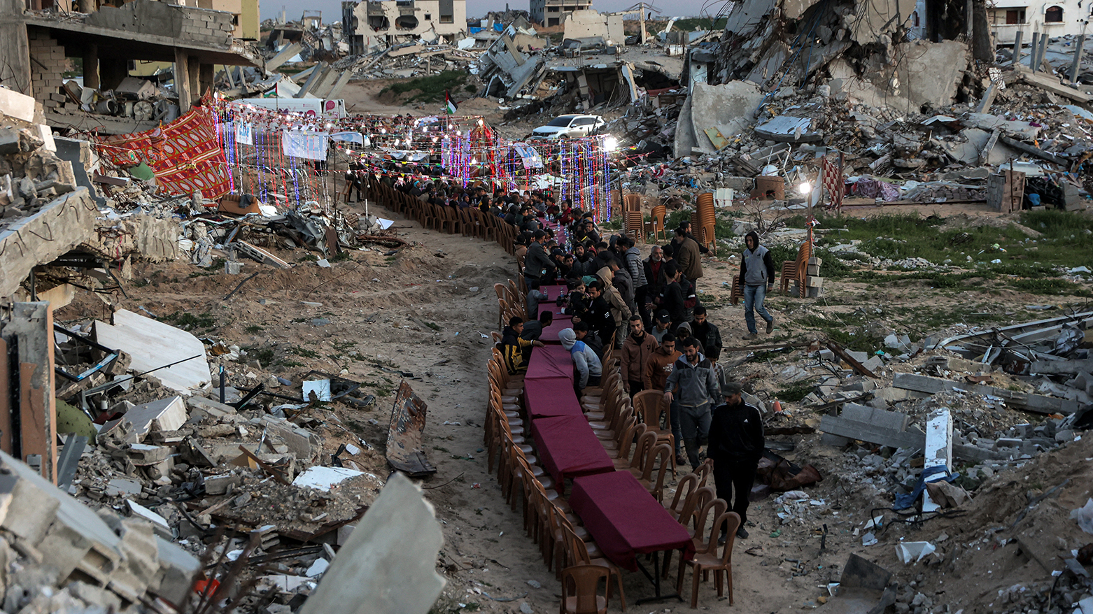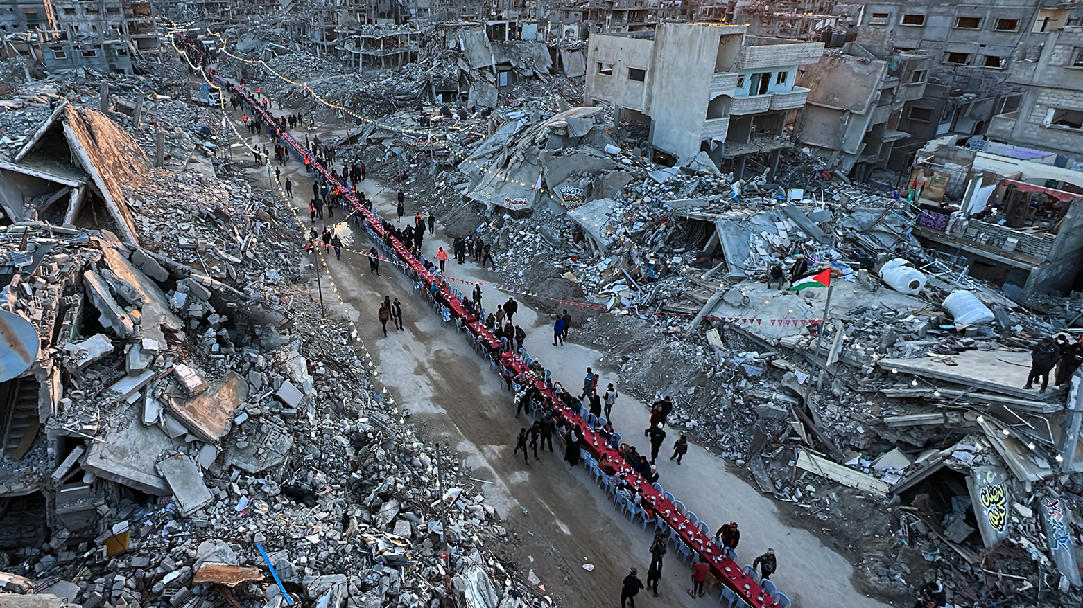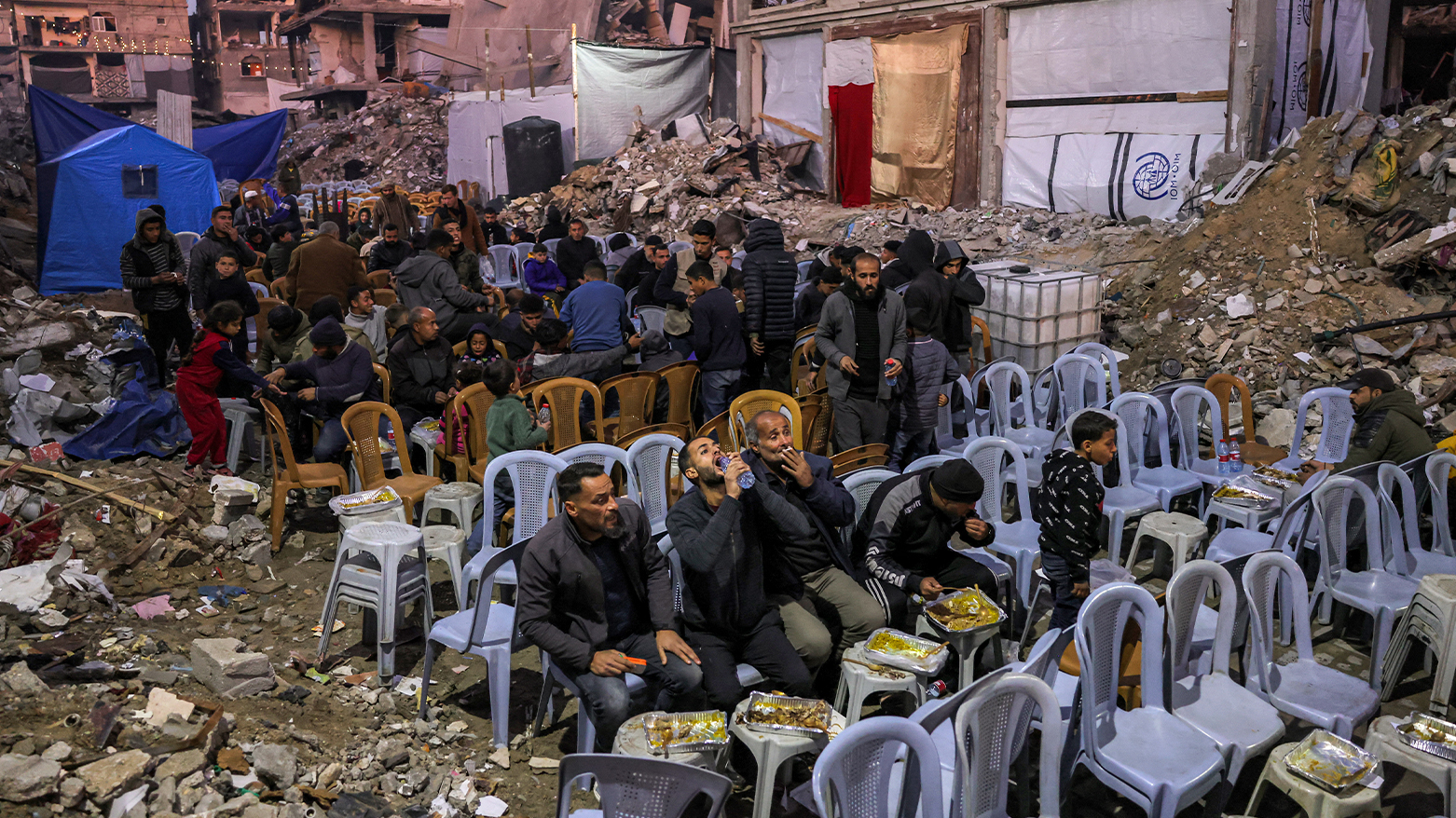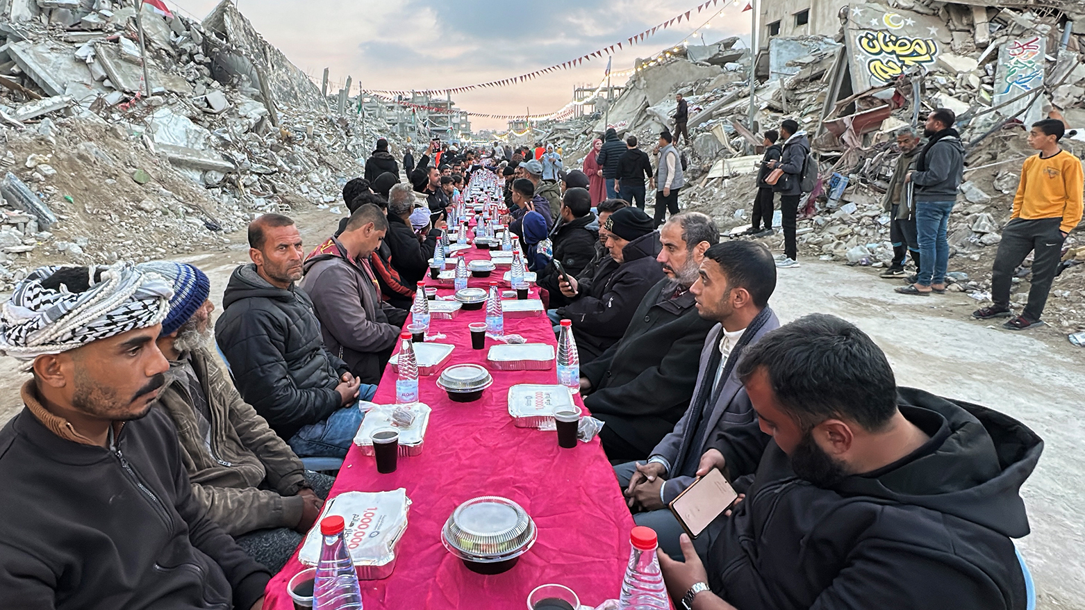 فەڵەستینییەکانی کەرتی غەززە، لە نێو وێرانەیی خانوو و باڵەخانە ڕووخاوەکاندا لە شاری ڕەفەحی باشووری کەرتەکە ئامادەکارییان کردووە بۆ ئەوەی بەربانگی ڕەمەزان بکەنەوە.