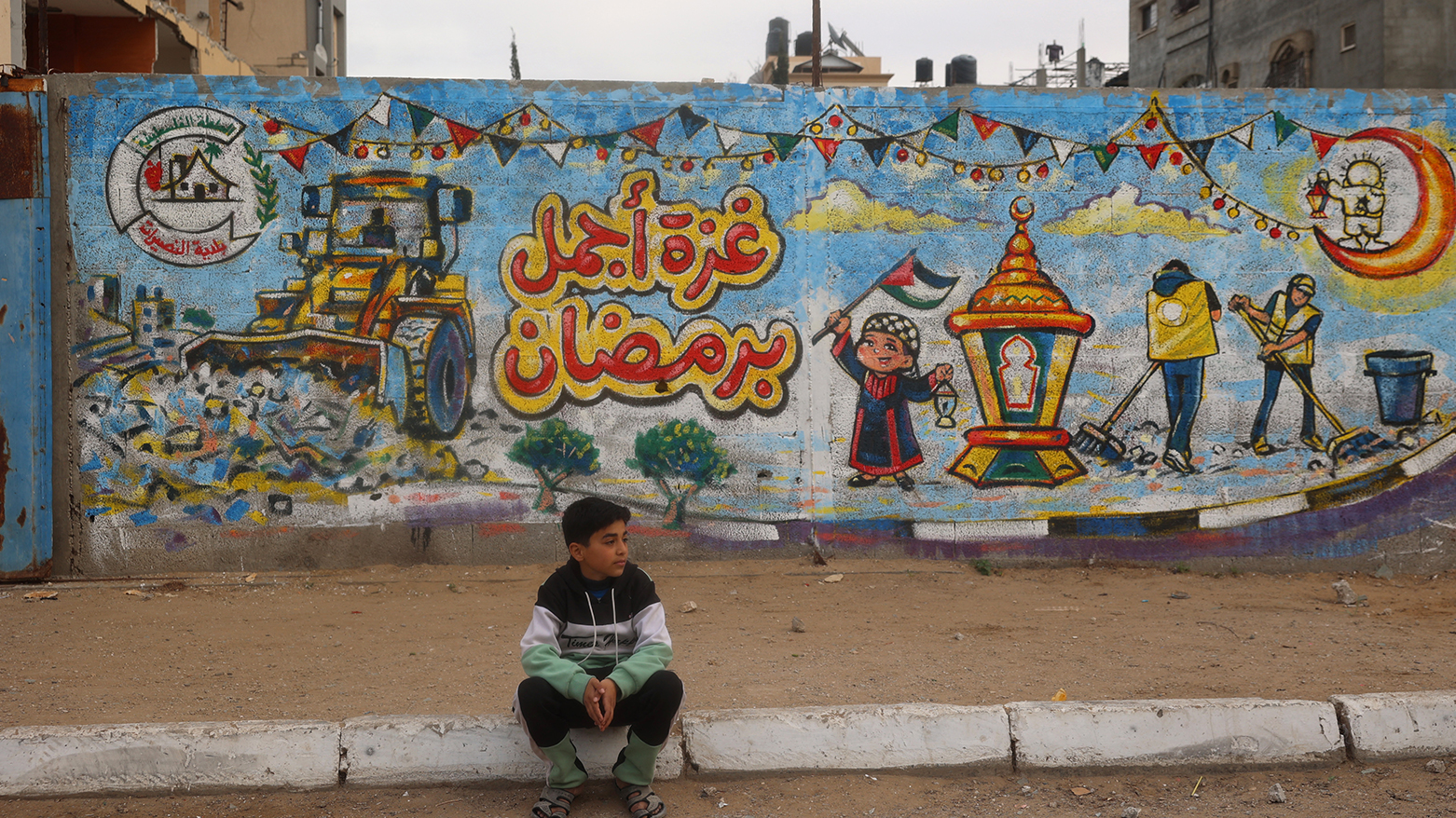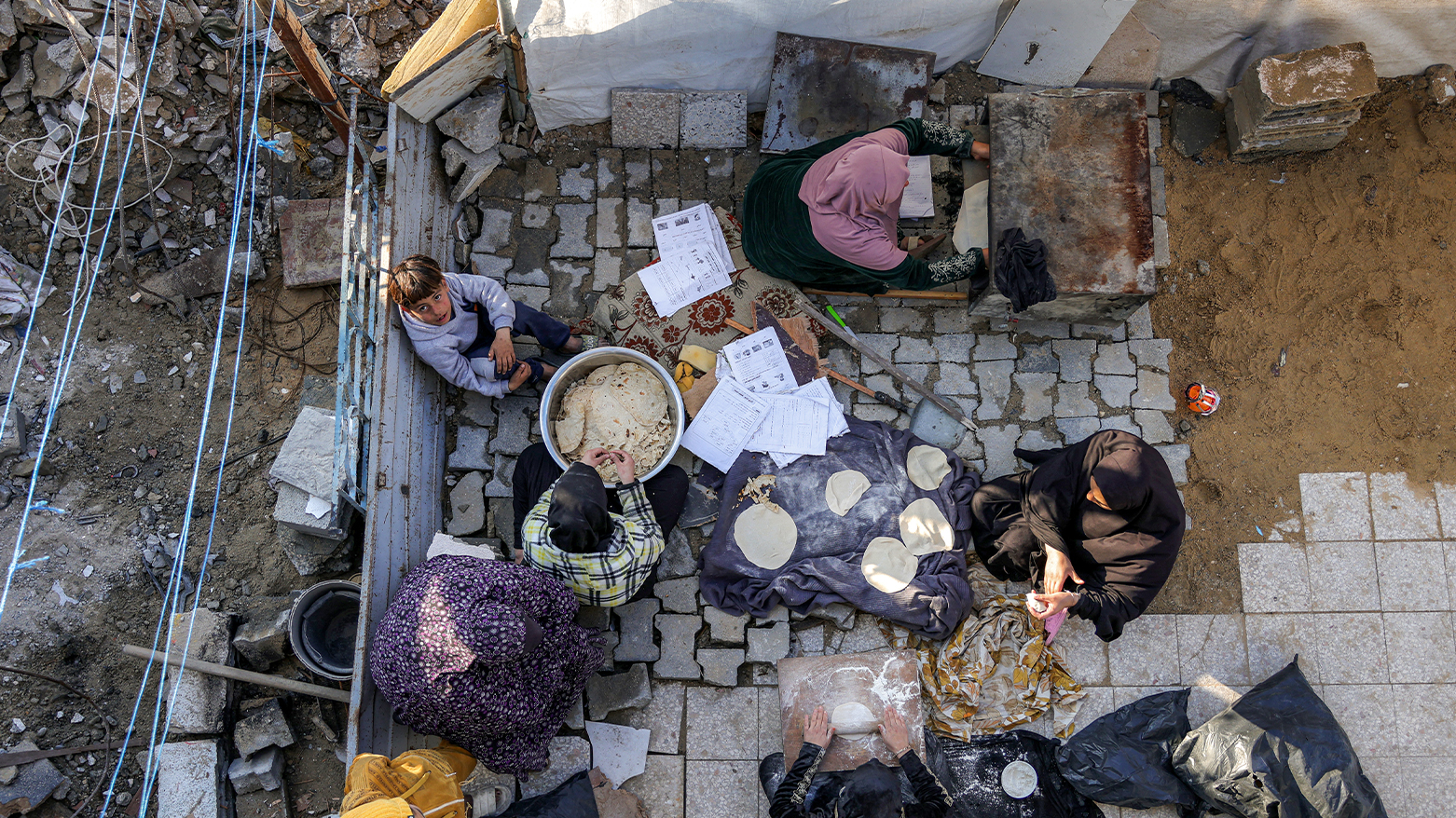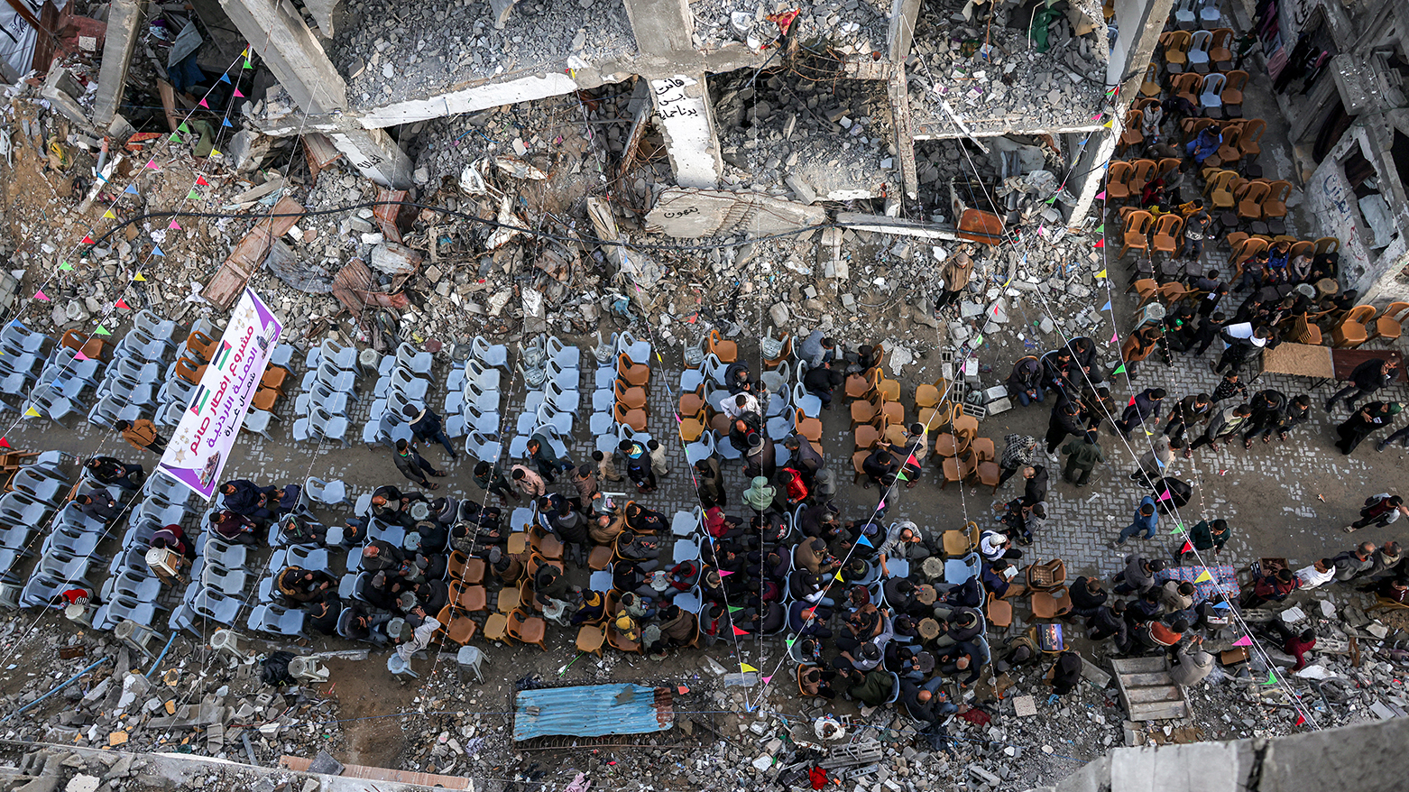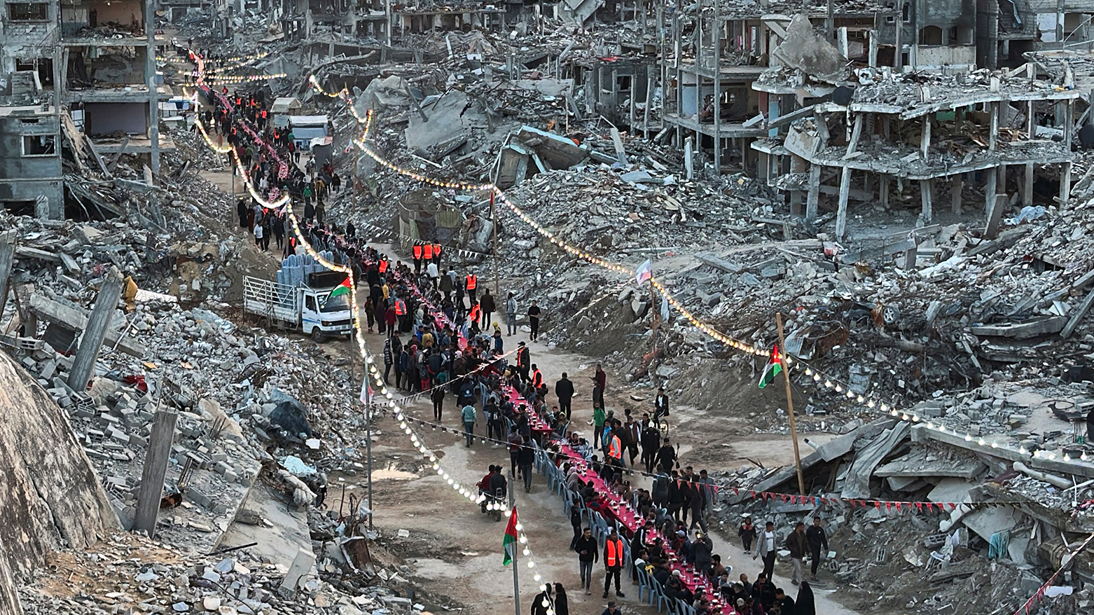فەڵەستینییەکانی کەرتی غەززە، لە نێو وێرانەیی خانوو و باڵەخانە ڕووخاوەکاندا لە شاری ڕەفەحی باشووری کەرتەکە ئامادەکارییان کردووە بۆ ئەوەی بەربانگی ڕەمەزان بکەنەوە.