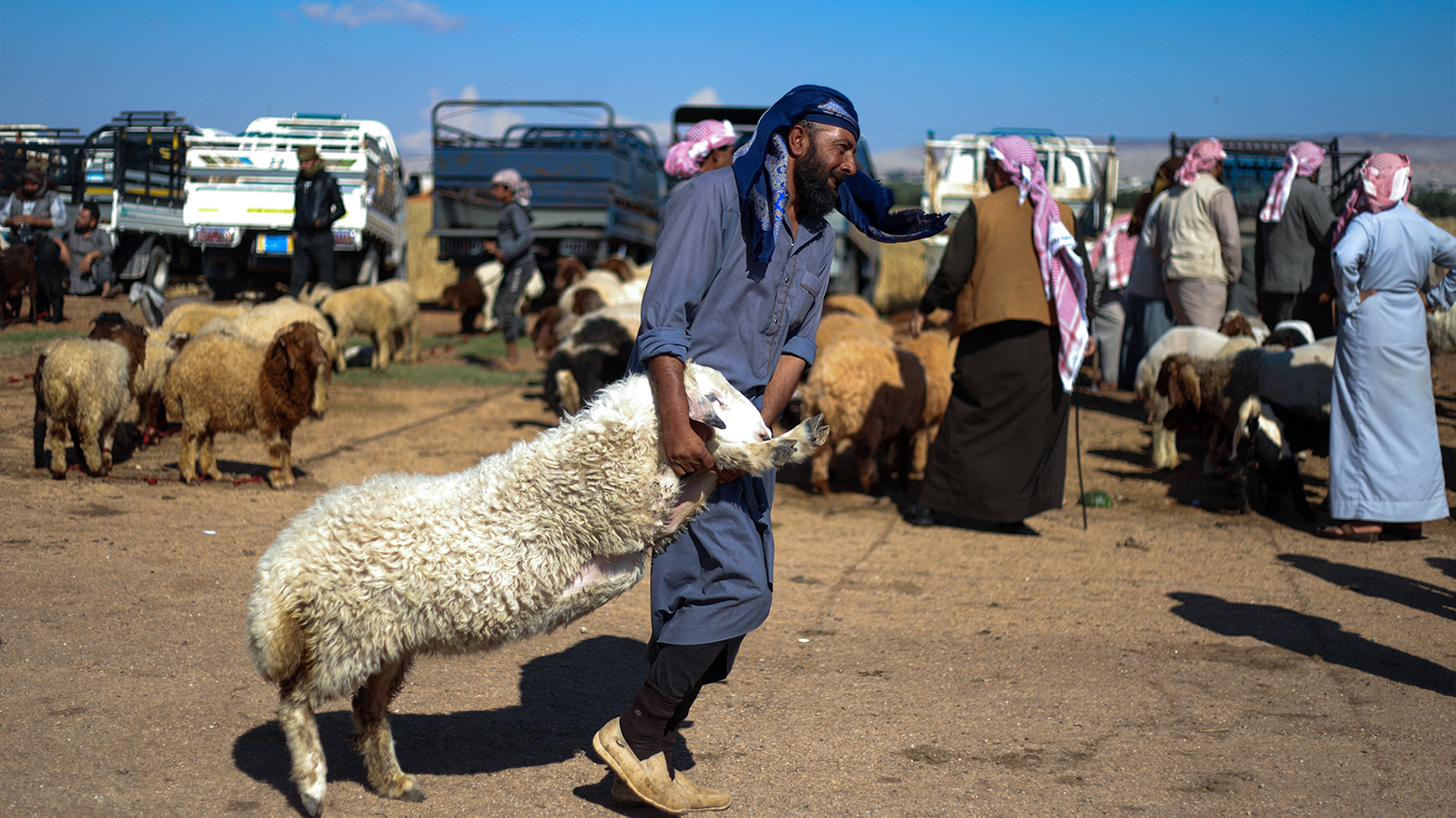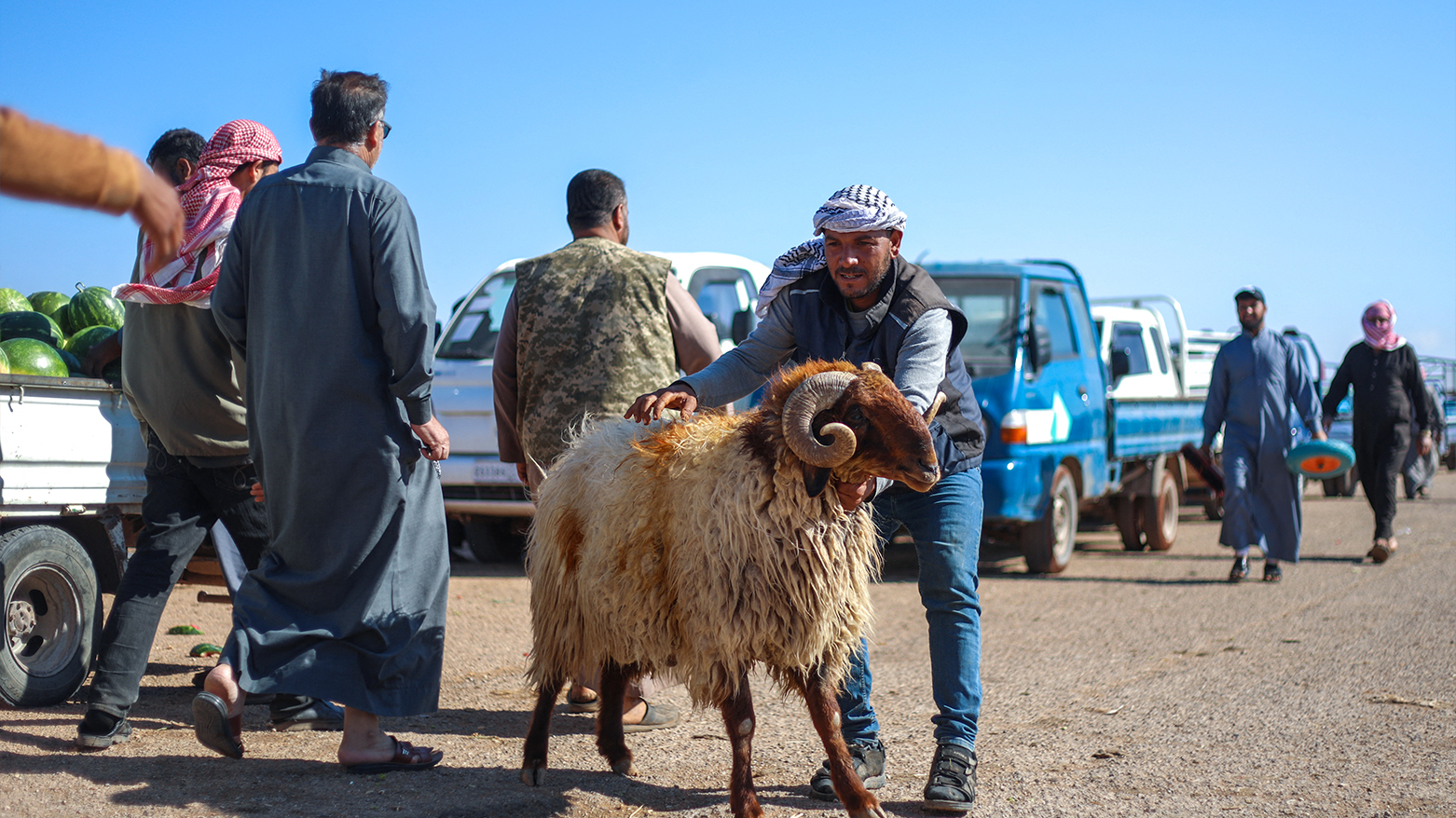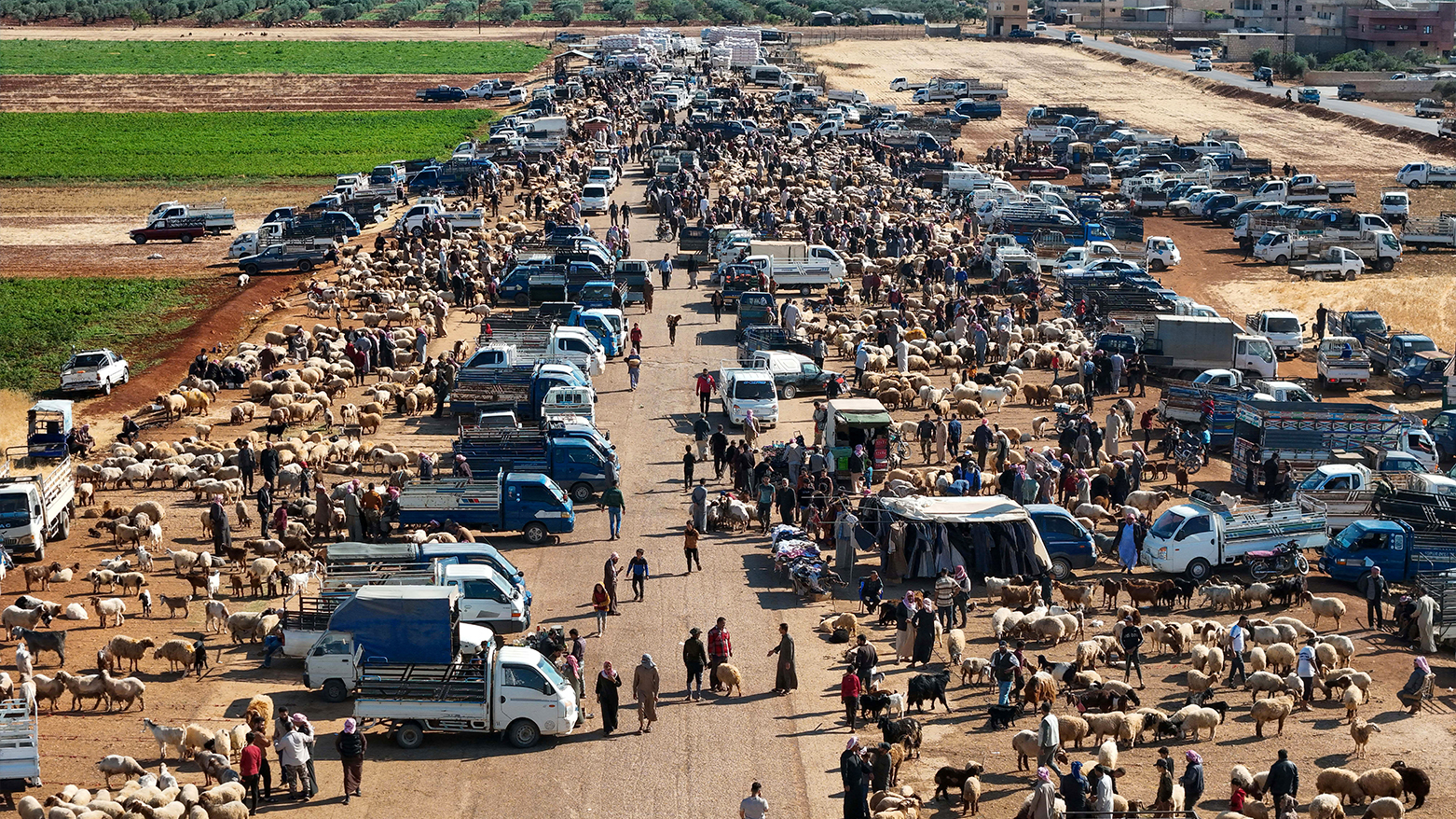 دیمەنی بازاڕی ئاژەڵفرۆشانی مەعرەت مسرین لە باکووری ئیدلب لە سووریا، بە نزیکبوونەوەی جەژنی قوربانی پیرۆز جمەی دێت لە هاووڵاتییان، خەڵکی بۆ کڕینی ئاژەڵی قوربانی ڕوو لەو بازاڕە دەکەن بۆ ئەوەی بە گوێرەی توانا ماددییەکانیان بەشداری لە قوربانیدان و پیرۆزکردنی ئەم جەژنە بکەن، لە دوای ڕووخانی ڕژێمی بەشار ئەسەد، ئەمە دووەمین جەژنە خەڵکی سووریا بەشداری ڕێوڕەسمەکان دەبن.