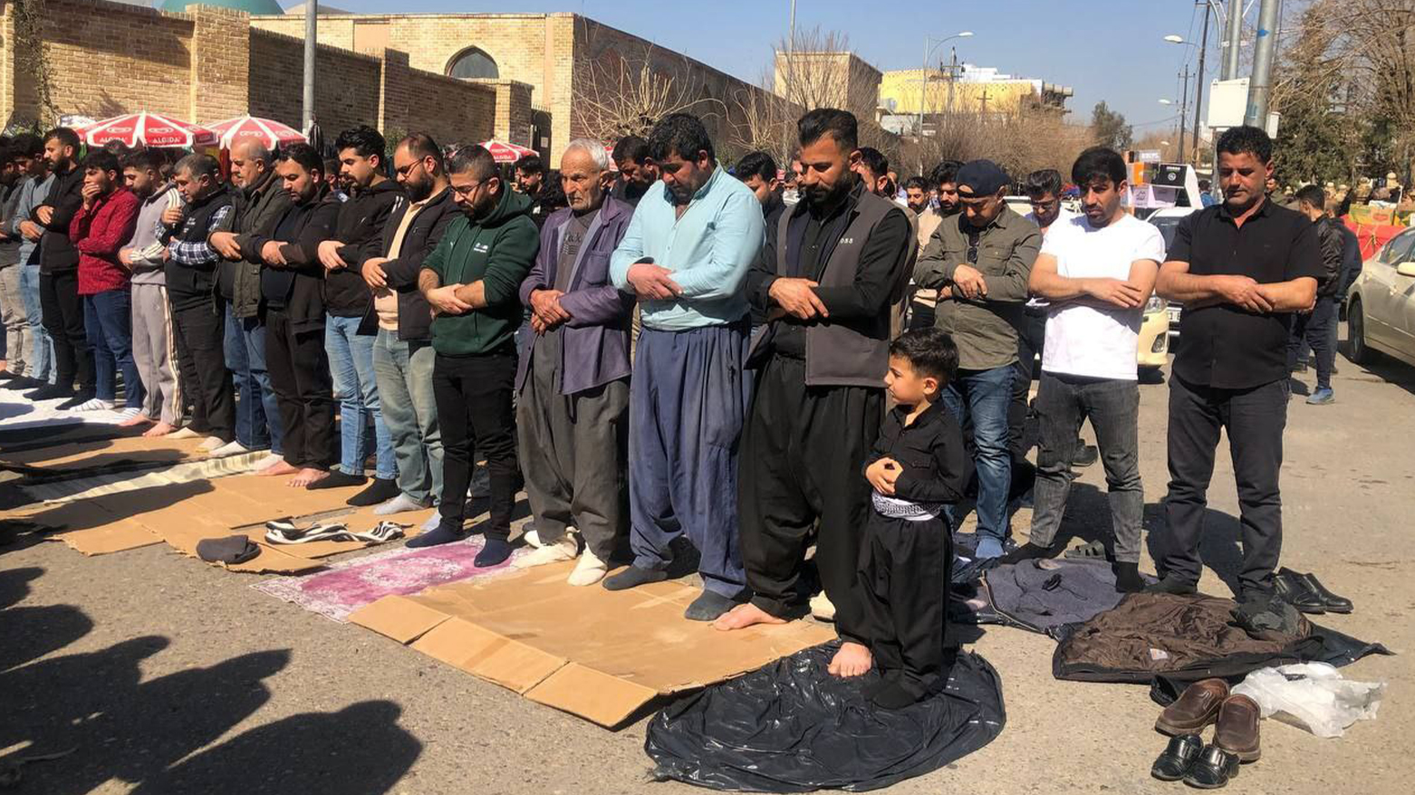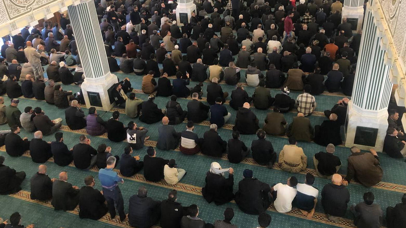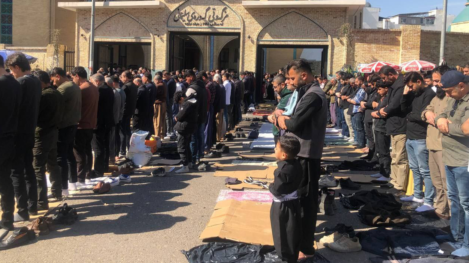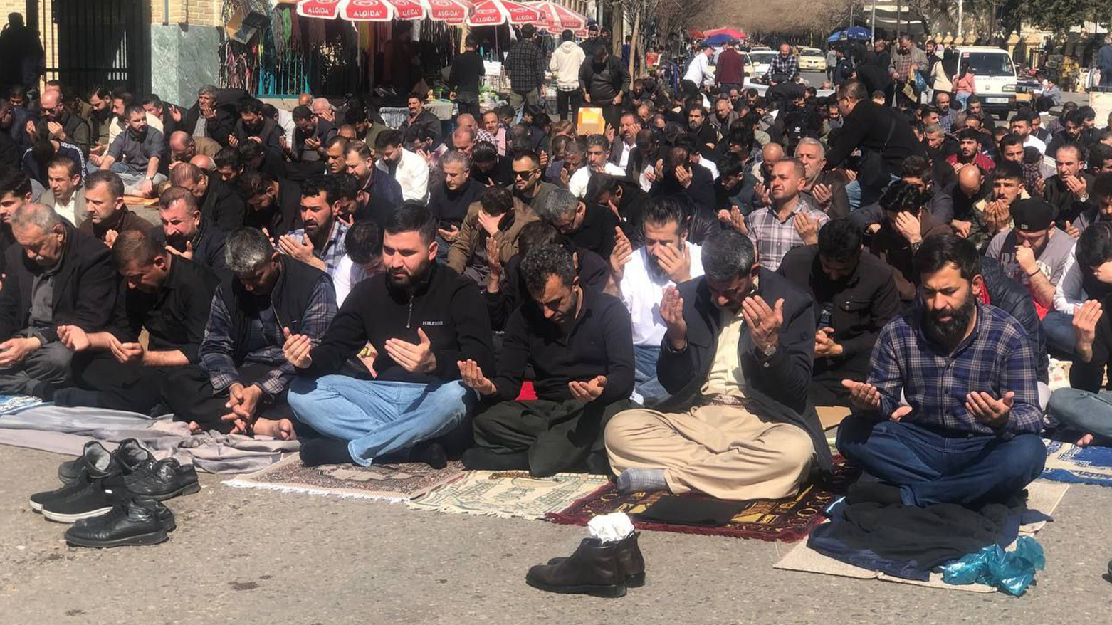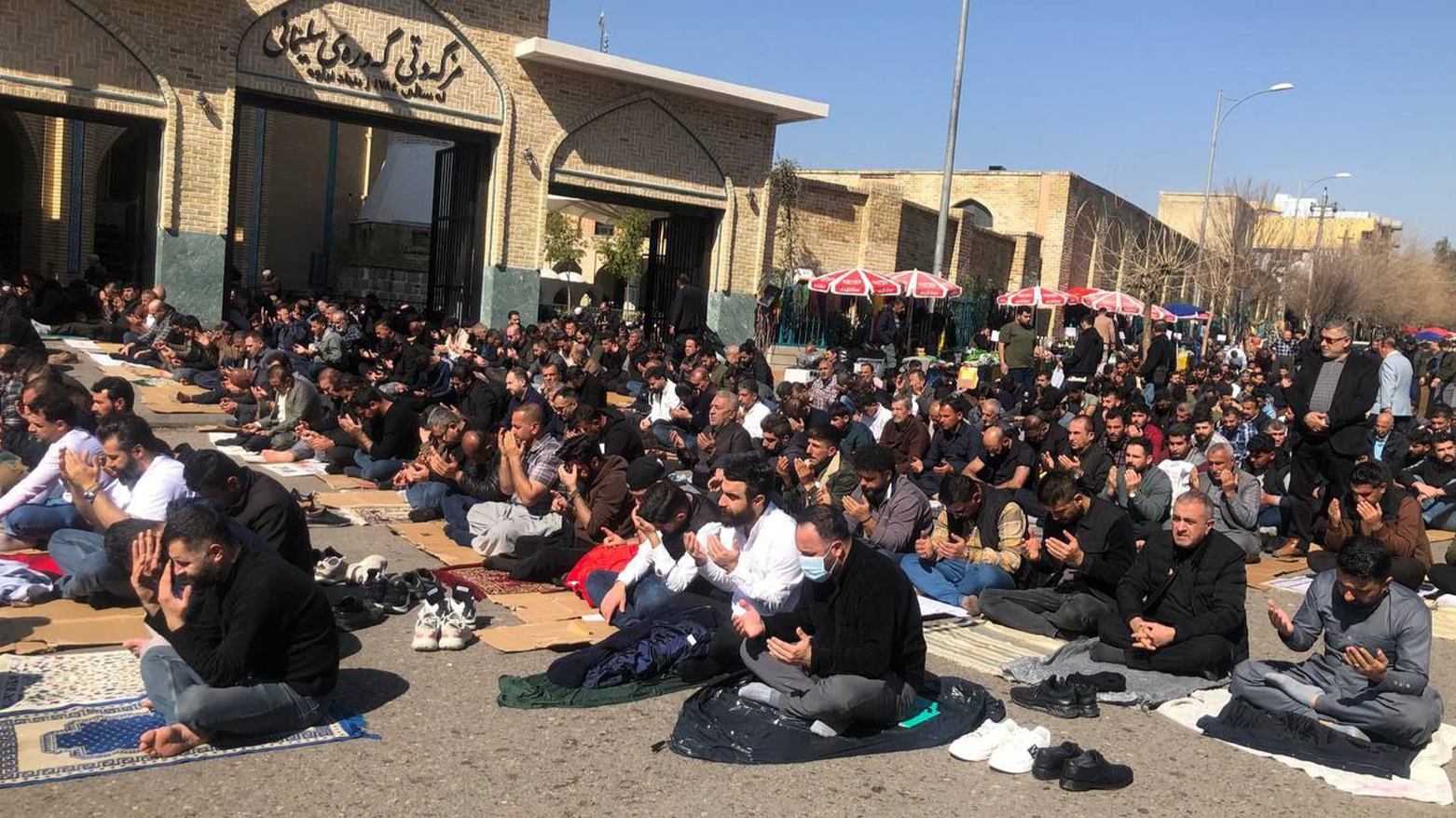 دیمەنی نوێژخوێنان لە یەکەم هەینی مانگی رەمەزانی پیرۆزدا لە مزگەوتی گەورەی سلێمانی، کە بە مزگەوتی کاکەحمەدی شێخ ناسراوە، بەهۆی قەرەباڵغییەوە بەشێکی زۆر لە نوێژخوێنان لە ناو حەرەمی مزگەوتی گەورە شوێنیان نەبووەتەوە، بۆیە لە دەرەوە و لەسەر شەقام نوێژی بە کۆمەڵی هەینی دەکەن.
