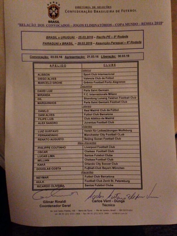 کارلۆس دۆنگا، راهێنەری هەڵبژاردەی بڕازیل لیستی یاریزانەکانی بۆ دوو یاریی داهاتووی هەڵبژاردەکەی لە پاڵاوتنەکانی مۆندیالی 2018 راگەیاند، کە تیاگۆ سێلڤای دوورخستووەتەوە.