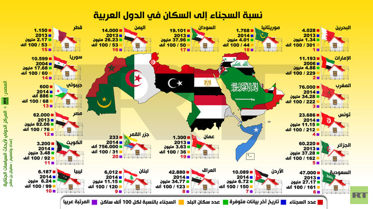 به گوێرهى ئامارهكان بهحرهين يهكهم وڵاتى عهرهبييه له رووى زۆرى ژمارهى زيندانييانهوه و له كۆتايى ريزبهندييهكهشدا مۆريتانيا دێت، كه به بهراورد لهگهڵ وڵاتانى ديكهى عهرهبى كهمترين ژمارهى زيندانيكراوانى ههيه. ههريهك له بهحرهين و ئيمارات و مهغريب و سعووديه و ئهردهن ريزى پێشوهى ريزبهندييهكهيان گرتووه و عێراقيش له ريزبهندى ههشتهمدايه.