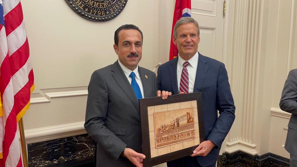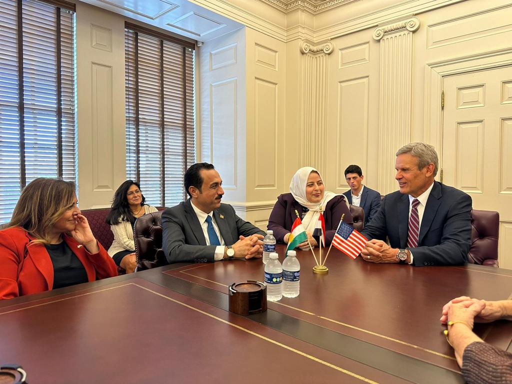 لە چوارچێوەى سەردانەکەیدا بۆ ویلایەتە یەکگرتووەکانى ئەمەریکا، ئەمرۆ پێنجشەممە، 2023.9.7، ئومێد خۆشناو، پارێزگارى هەولێر، بە یاوەرى تریفە عەزیز، نوێنەرى حکومەتى هەرێمى کوردستان لە ئەمەریکا و شاندى یاوەرى، لەگەڵ بێڵ لى، حاکمى ویلایهتی تێنسى کۆبووەوە.
