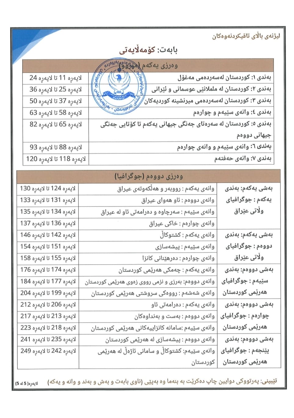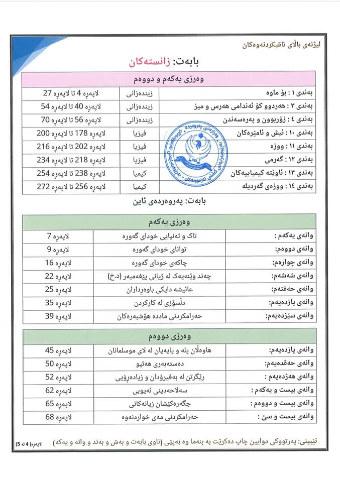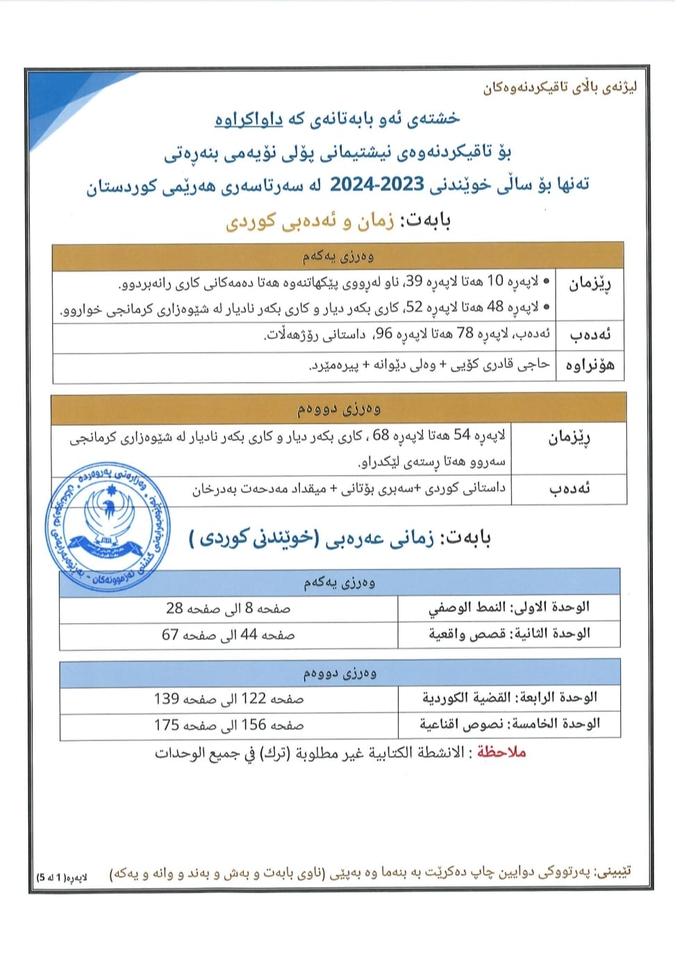 لە نوسراوەکەی وەزارەتی پەروەردە خشتەی پرۆگرامی خوێندنی ئەو بابەتانەی بۆ ناردوون، کە تاقیکردنەوەی پۆلی نۆی بنەڕەتی بۆ خولی یەکەم و دووەم ساڵی 2023-2024ـی تێدا ئەنجام دەدرێت.