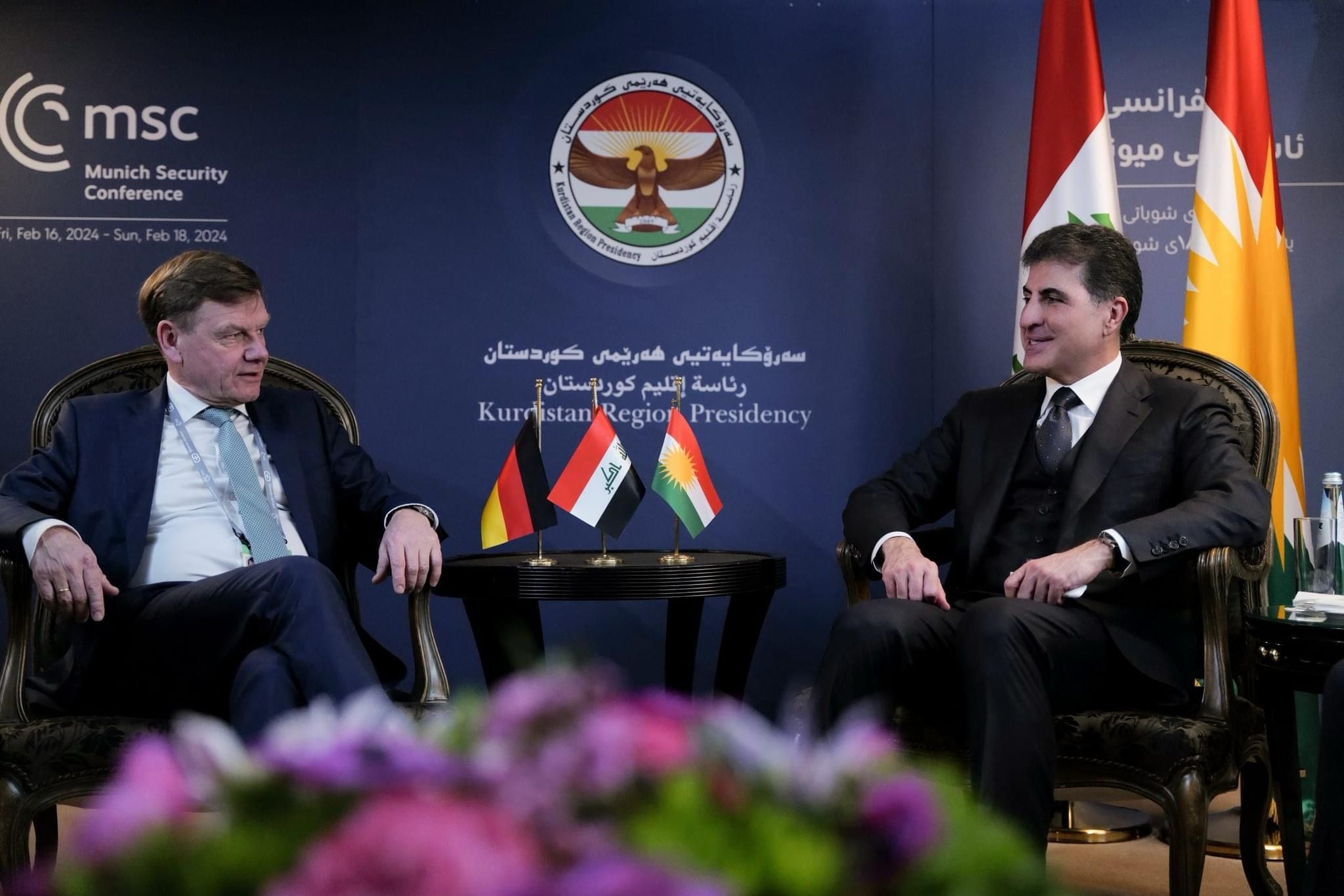 ئەمڕۆ شەممە، 17ـی شوباتی 2024، سەرۆکایەتی هەرێمی کوردستان رایگەیاندووە، لە کۆنفڕانسی ئاسایشی میونشن لە ئەڵمانیا، نیوەڕۆی ئەمڕۆ نێچرڤان بارزانی، سەرۆکی هەرێمی کوردستان، لەگەڵ گرووپێكى په‌رله‌مانتارانى حزبى SPD و گرووپێكى ديكه‌ى هه‌ردوو حزبى CDU و CSUى ئه‌ڵمانى کۆبۆوە و په‌يوه‌ندييه‌كانى ئه‌ڵمانيا له‌گه‌ڵ عێراق و هه‌رێمى كوردستان و دۆخى ناوچه‌كه‌يان تاوتوێ كرد.