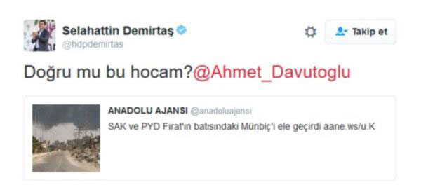 دهمیرتاش له ههژماری تایبهتی خۆی له تویتهر، ئهو كۆمێنتهی ئاژانسی ئانادۆل بڵاو كردۆتهوه و بۆی نووسیوه: " ئهوه راسته مامۆستام؟ Ahmet_ Davutoglu@".