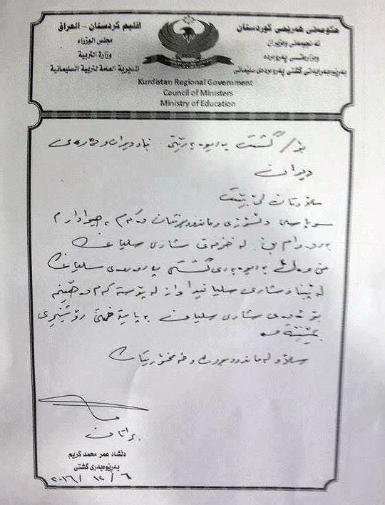 وێنەیەك لە دەقی نامەی دەست لەكاركێشانەوەی بەڕێوەبەری گشتی پەروەردەی سلێمانی