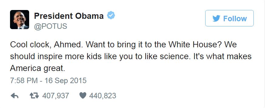 دواتر سهرۆك باراك ئۆباما له كۆشكی سپی پێشوازی له ئهحمهد كرد،دژی دیاردهی ترس له ئیسلام پاڵپشتی خۆی بۆ دهربڕی و له تۆڕی كۆمهڵایهتی تویتهر نوسیبووی" كاتژمێرهكهت مهزنه ئهحمهد" دهتهوێت لهگهڵ خۆت بیهێنیت بۆ كۆشكی سپی،لهسهرمان پیویسته بایهخی زیاتر به منداڵی وهك تۆ بدهین تا عاشقی زانست بێت،چونكه زانست وادهكات ئهمریكا وڵاتێكی پێشكهوتوو بێت.