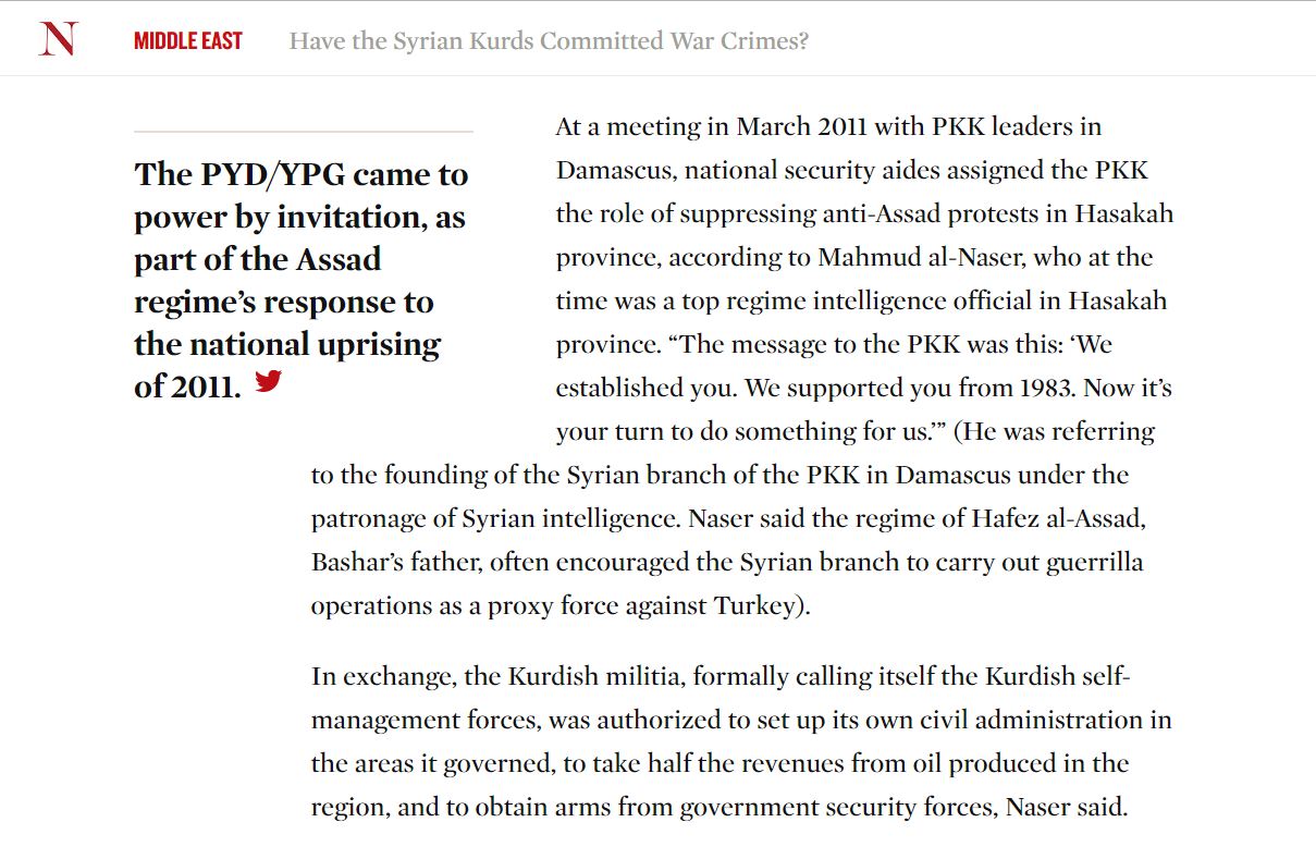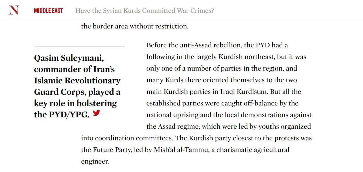 گۆڤارێكى دێرين و پڕ خوێنهرى ئهمريكا، له بهدواداچوونێكدا بڵاويكردووهتهوه، كه له شارى سلێمانى "قاسم سولهيمانى نێوهندگيرى ئهسهد و پهيهدهى كردووه و رۆژئاواى كوردستان كهوتووهته ژێر ههژموونى ئێران و ئهسهد". ئاشكراشيكردووه، "ميليشياكانى يهپهگه زۆر تاوانى دژه مرۆڤيان دهرههق به هاووڵاتيانى كورد و عهرهب ئهنجامداوه و چهندين ماڵ و خانووى عهرهبهكانيان رووخاندووه".