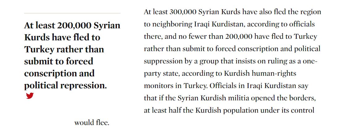 له درێژهى بهدواداچوونهكهدا ريپۆرتهرهكه نووسيويهتى: ئهو هێزه كورديانهى رۆژئاوا كه ئيدارهى ئۆباما به پاڵهوان ناويان دهبردن كهچى كورد و عهرهب لهبهر زۆردارى و پێشێلكارييهكانيان له دهستيان ههڵدێن.